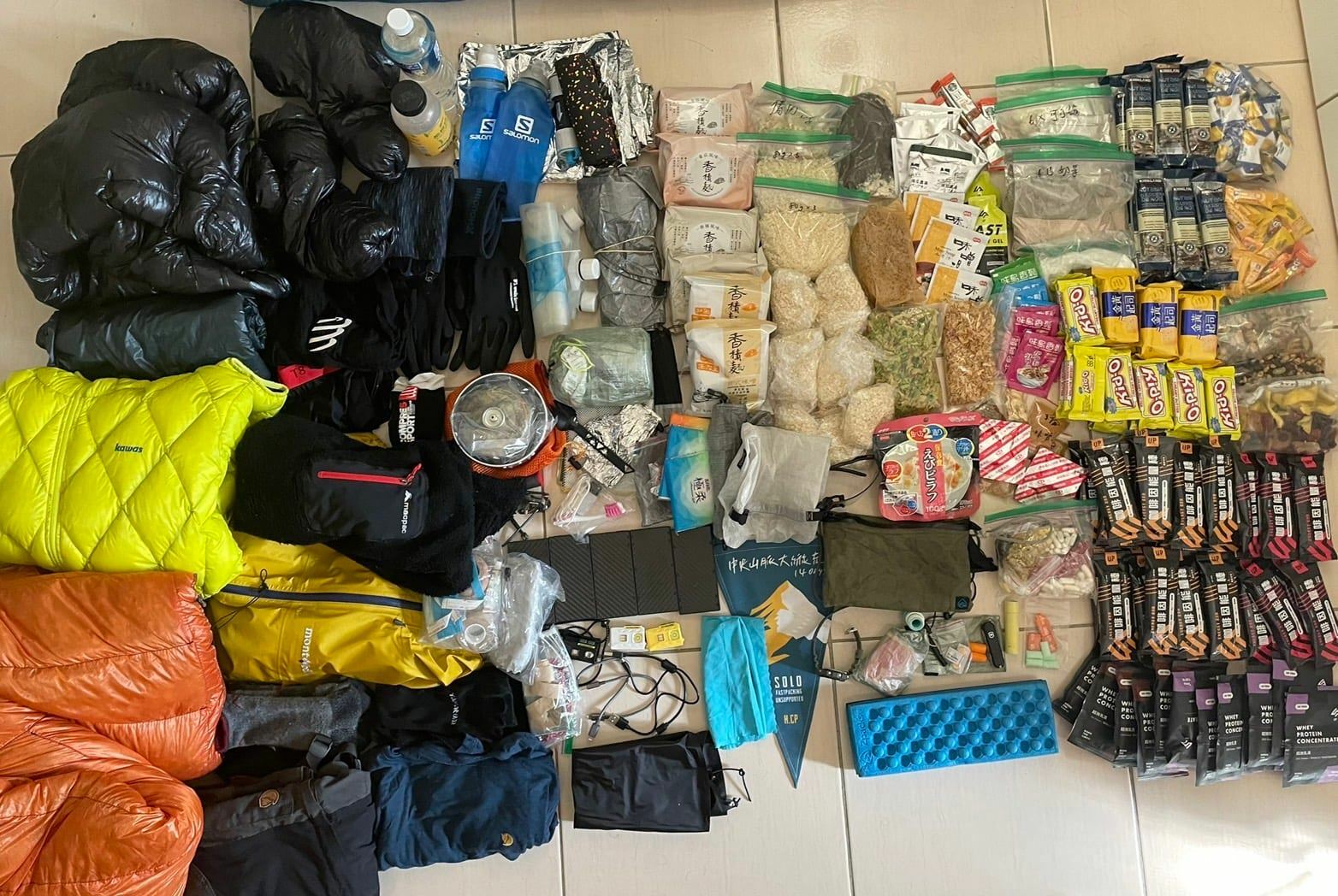 每天攜帶500g食物,14天共7kg的糧食分配,食物必須全部脫水,並以高脂肪的食物為優先考量,以能夠快速食用,不需要過多烹調以及快速加熱的為主。但依然要考量碳水、蛋白質、脂肪均衡均衡攝取到。另外選擇對自己有效果的功能性保健品、膠囊,補足身體不足的營養素,和加快身體恢復。最重要的出發前都要先自己在高山嘗試看看。
