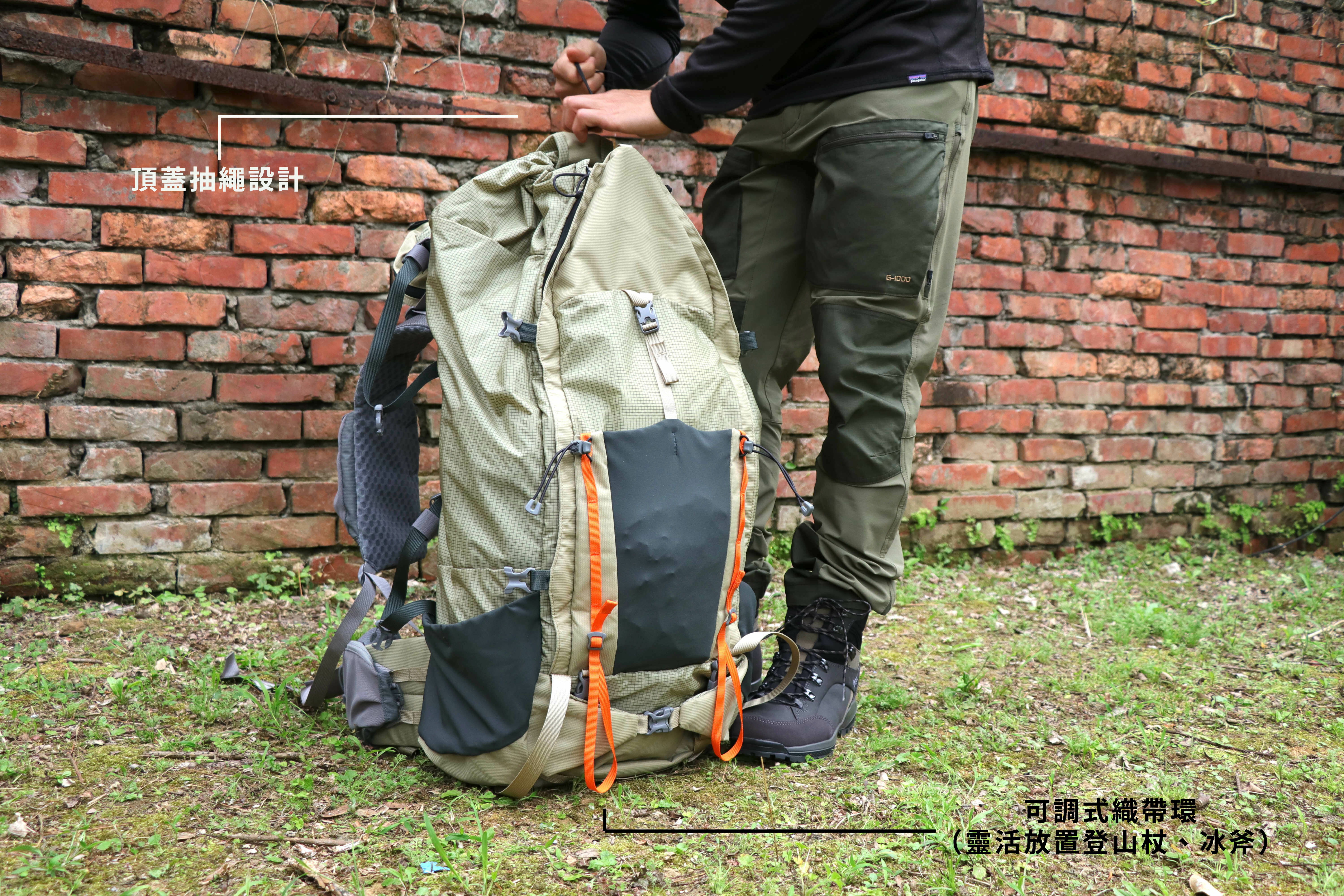 包體附有束帶與登山杖壓縮帶設計。