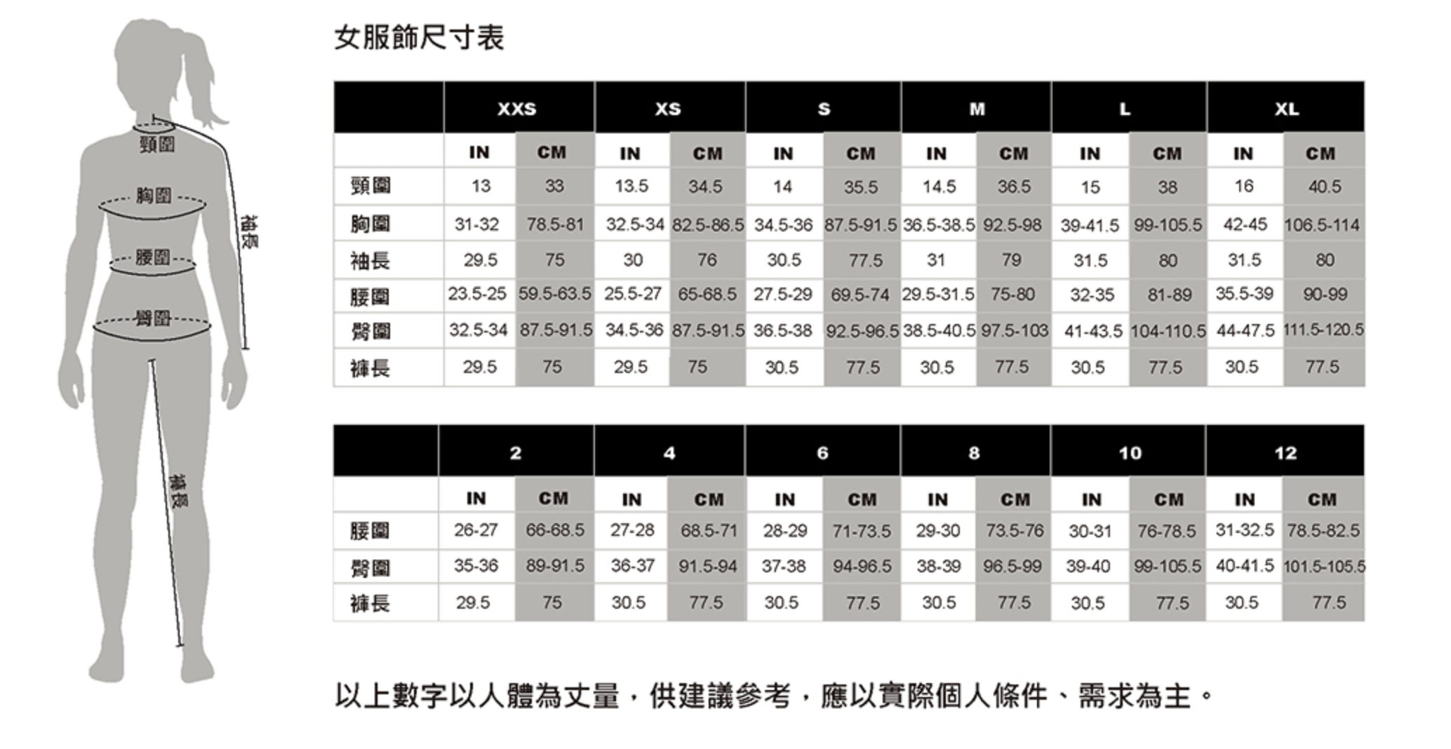 再依照Black Diamond 女性上衣/外套尺寸表,找到適合自己的size: