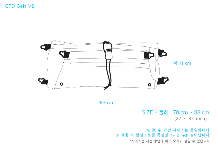 - 前腰帶:4個收納隔層(3個拉鍊口袋,1個敞口口袋(容量可調整))