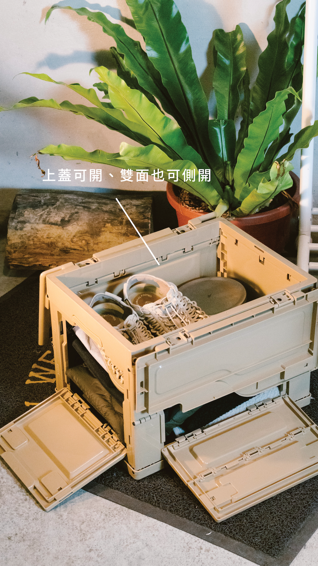 本次摺疊箱改版,除整體容量升級變大之外,有別於舊版僅單面側開,新版更改為雙面皆可側開,並在上蓋新增固定扣鎖,使用上更加不受限制。同樣採用輕巧的 PP 塑料材質,除了保留摺疊箱原有的便利性與機能性外,即使將多個收納箱疊加組合,無需搬動即可輕鬆收取物品。