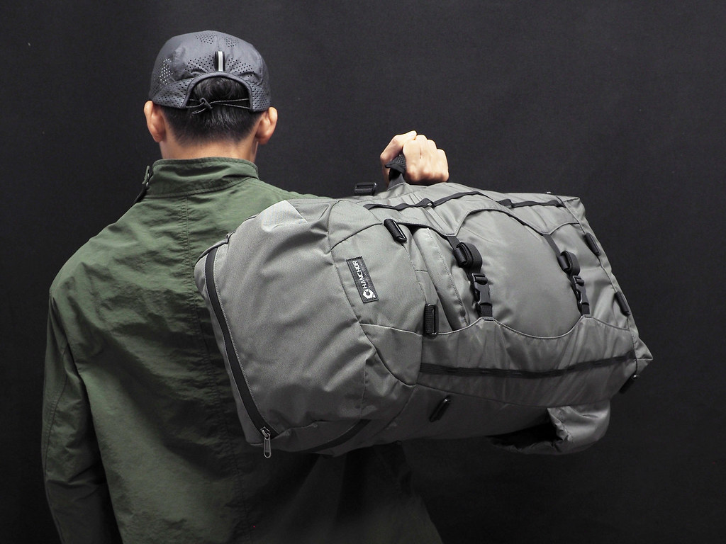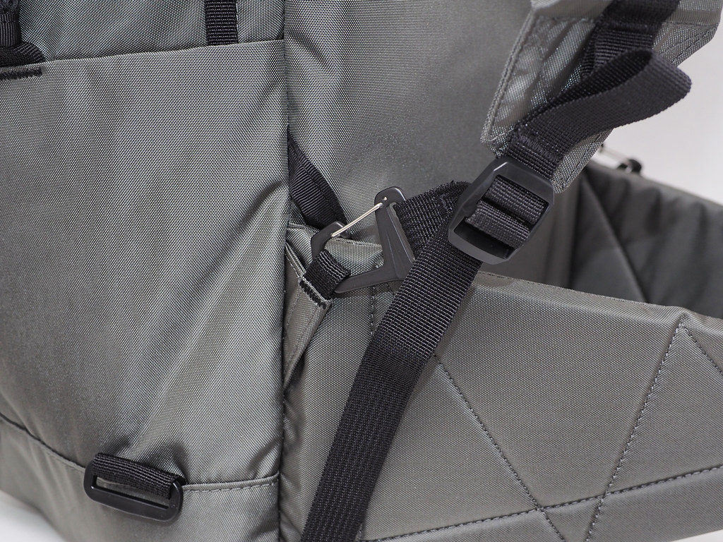 背帶與腰帶均採用可收納的設計,方便行李的托運收納,連接部份的鋁合金勾環打開後即能夠隱藏於包身背後的口袋,並可視需求轉換為手提模式使用。