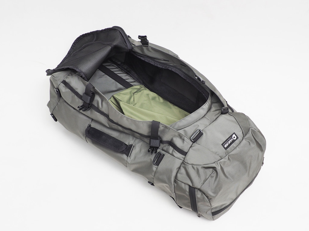 前方頂部雙開口設計:能夠有一般背包的上方壓縮收納,同時具有行李箱般攤開分類取物的機能。
