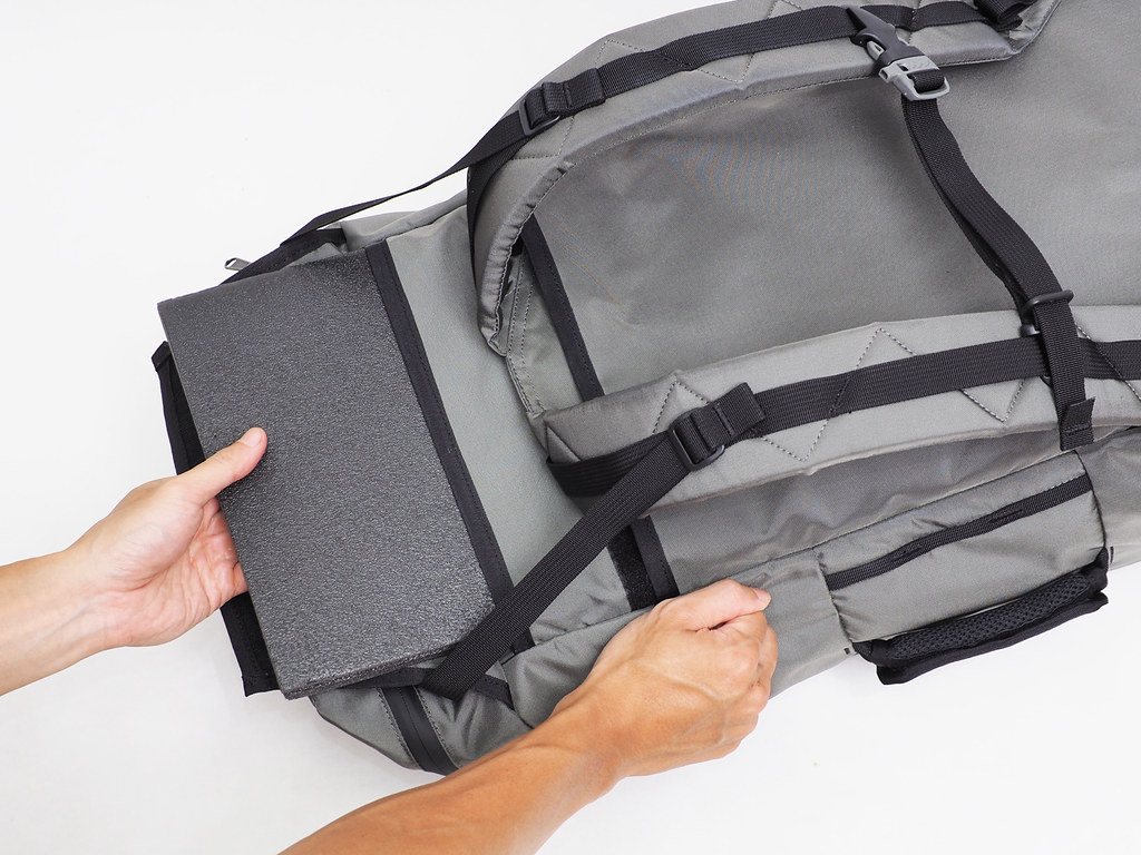 背負系統中的鋁條與泡綿背板均為可拆卸式的設計,其中的四折式泡綿展開後為 55cm*96cm,能夠作為野餐墊或是睡墊使用。