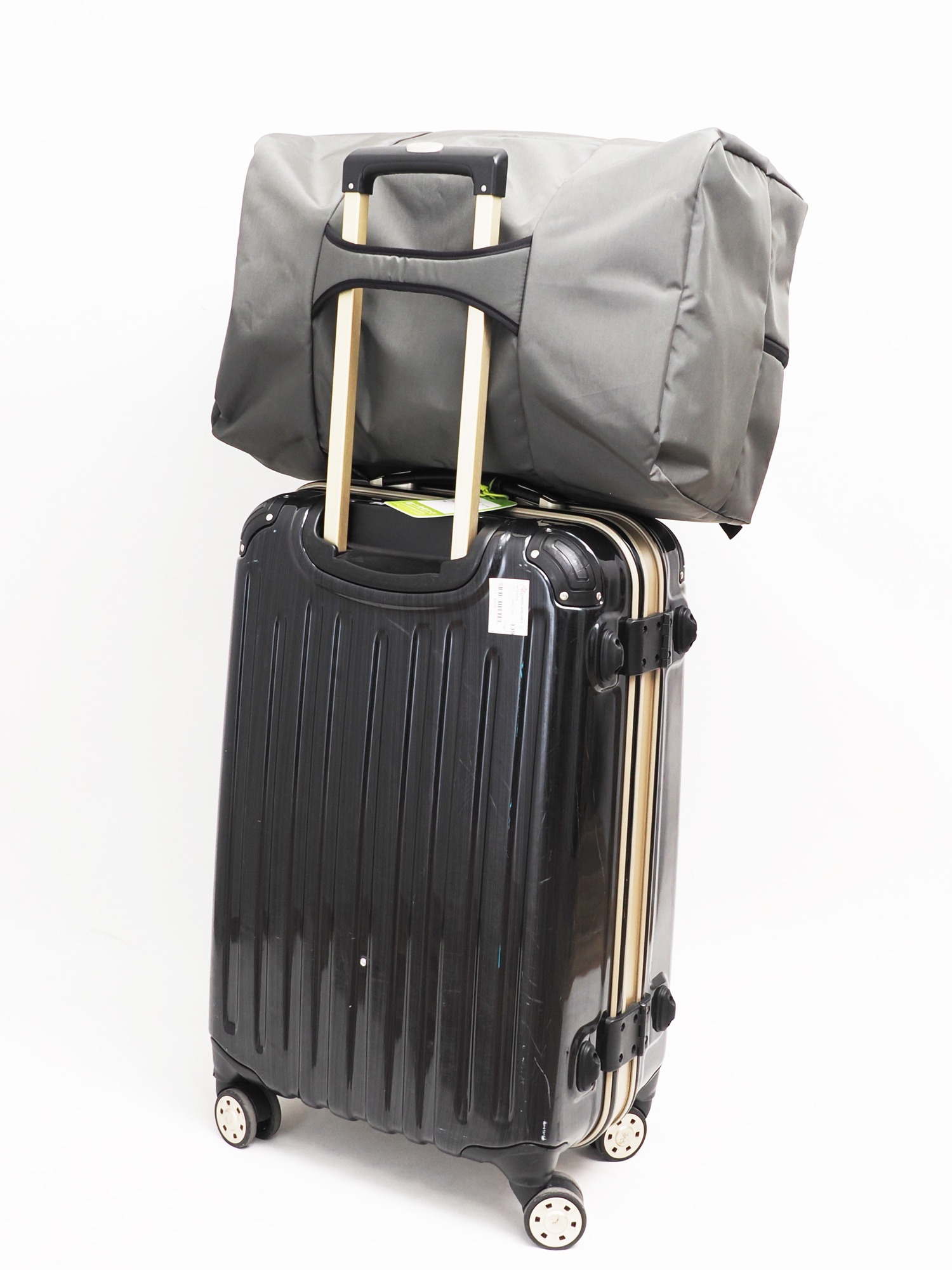 背面提把具有可插掛於行李箱拉桿之設計,能夠搭配行李箱使用;單用時亦可以直接手提。