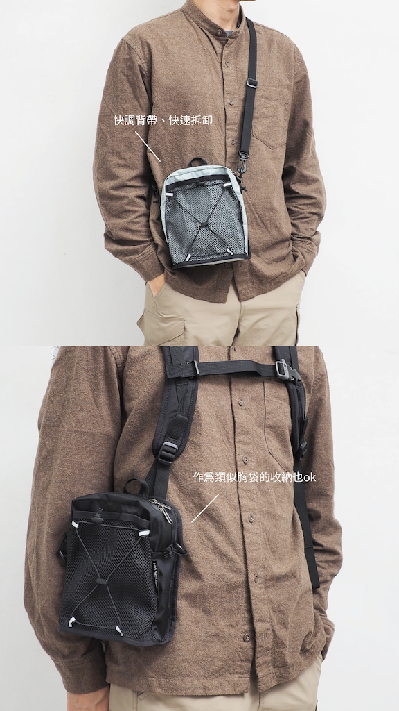 小包背後另外配有可卸式快扣一枚,卸除背帶後可搭配背包轉換機能使用。