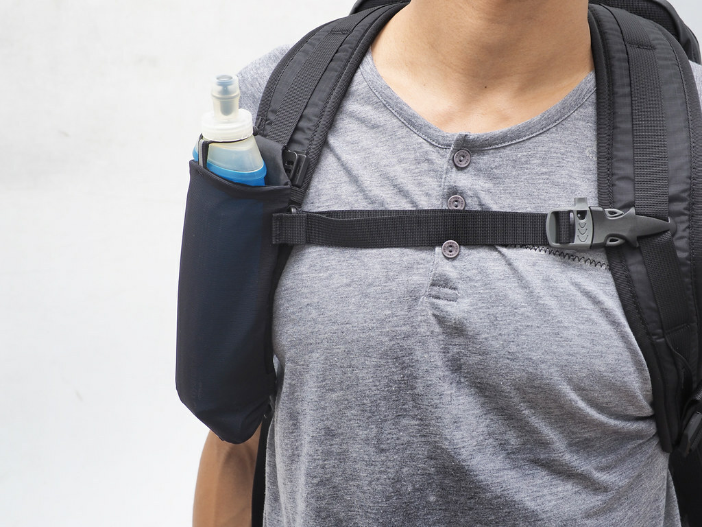 搭配包款肩帶擴充之輕量化肩前水壺袋,拆裝迅速方便,能夠妥善收納軟水壺或一般水瓶 (寶特瓶),提供便利補水機能。