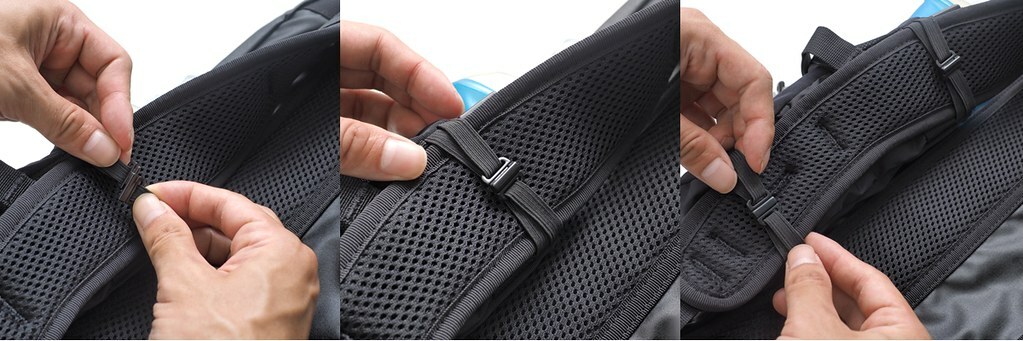* 若有胸扣設計之包款建議胸扣位置約在上下兩組包覆固定機制中間,能提供額外的制動力。