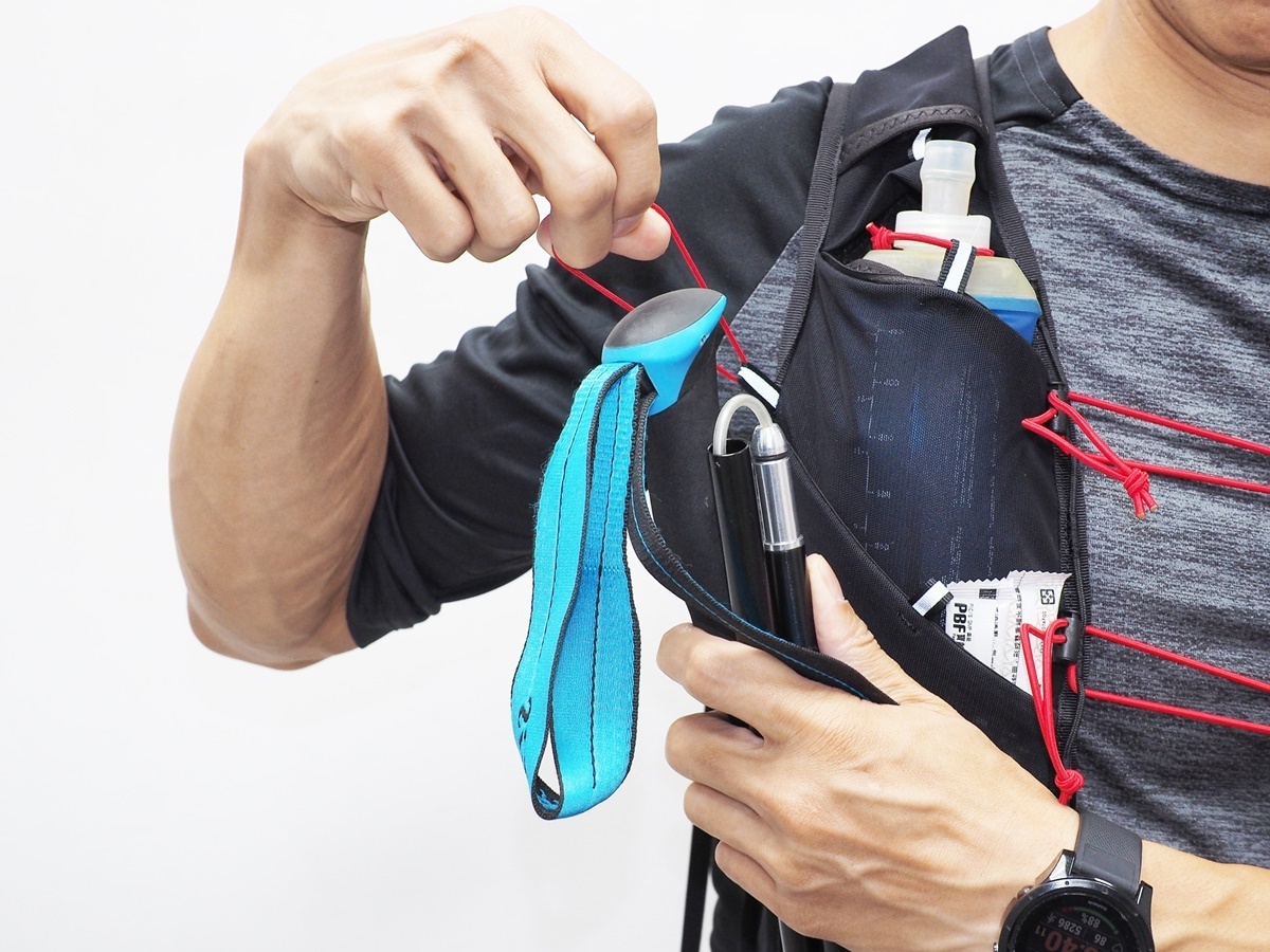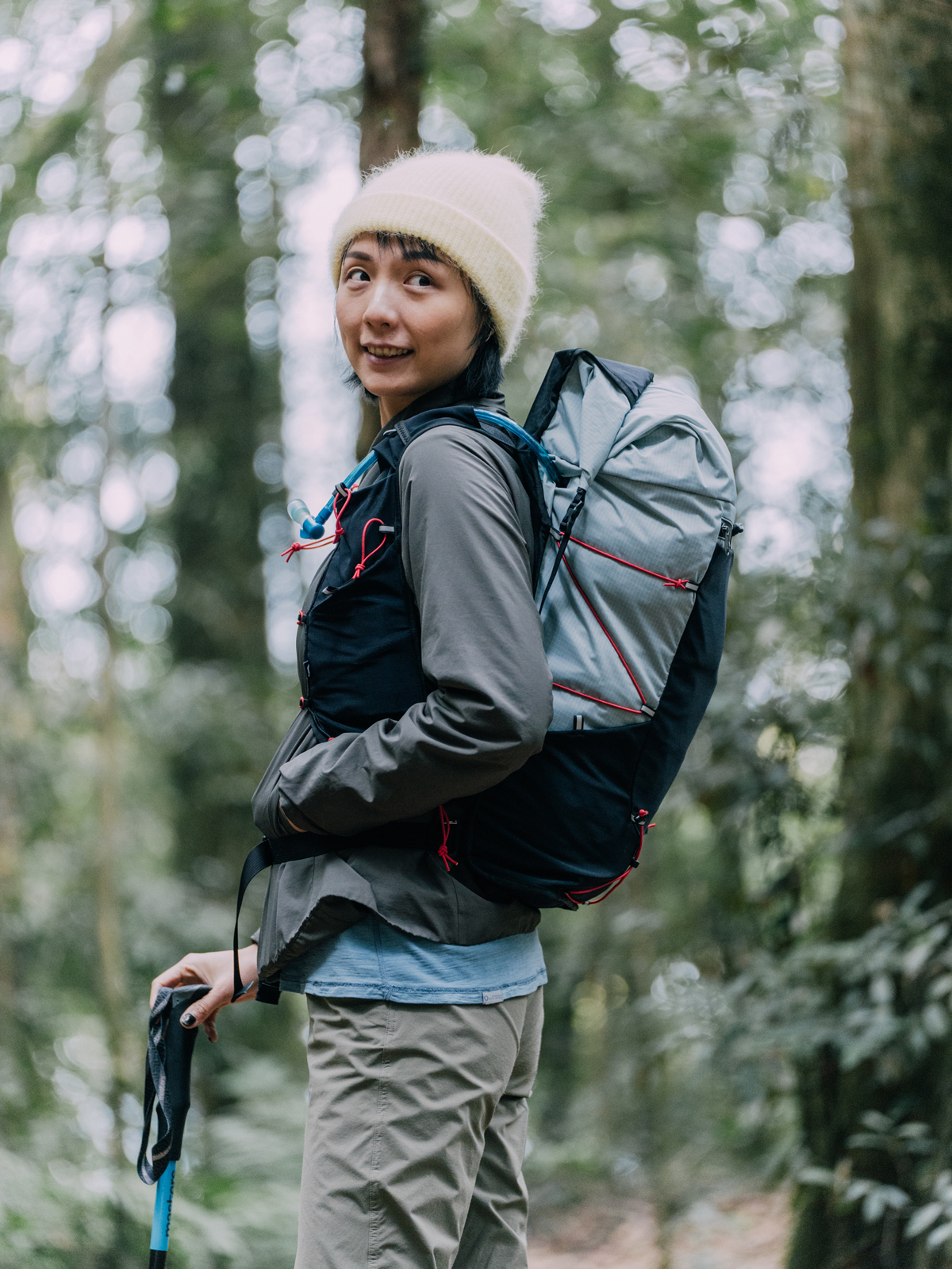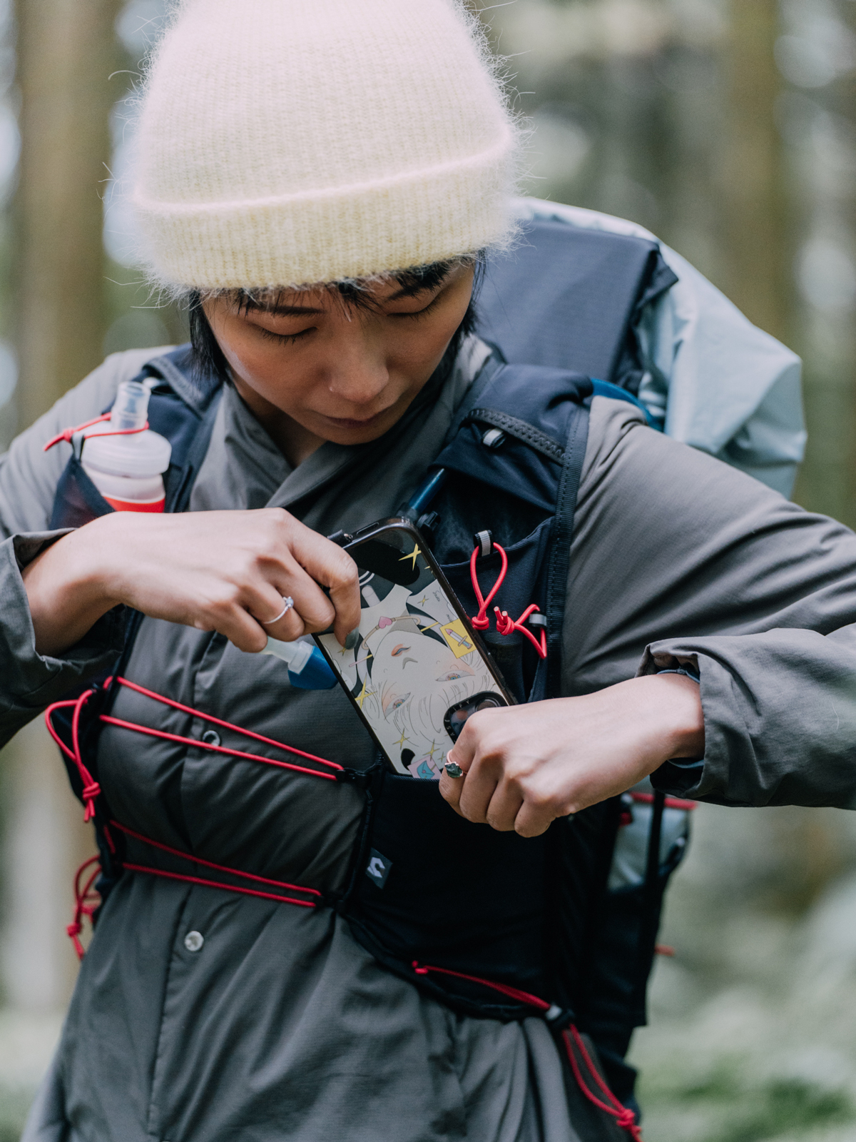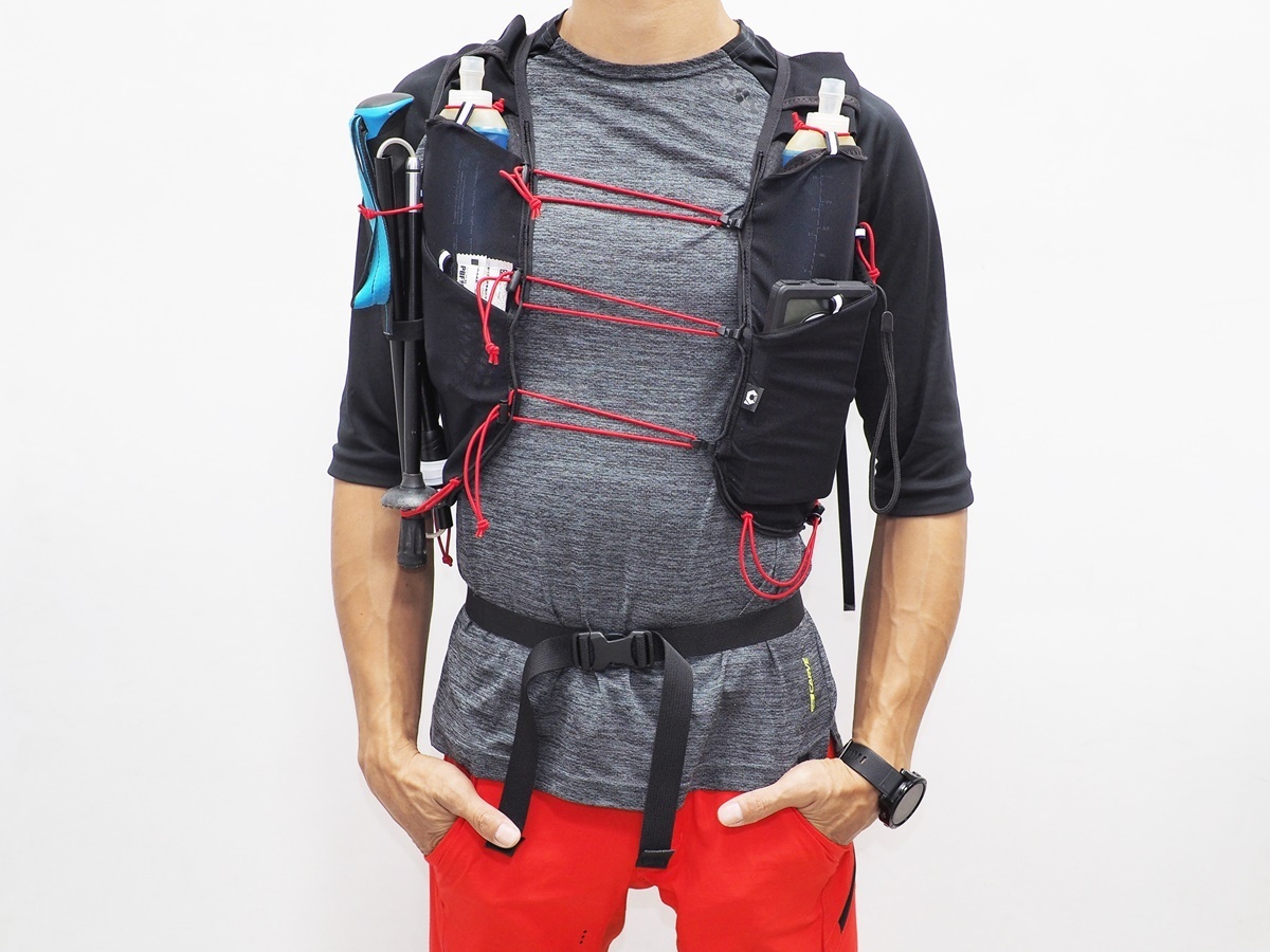 穿著式的背心背負系統不僅能提供良好的穩定背負,彈性網布製作的肩前口袋系統還能給你最即時方便的取物與收納,適合放置軟水壺、能量棒、手機這類隨時會拿取的各種小物。
