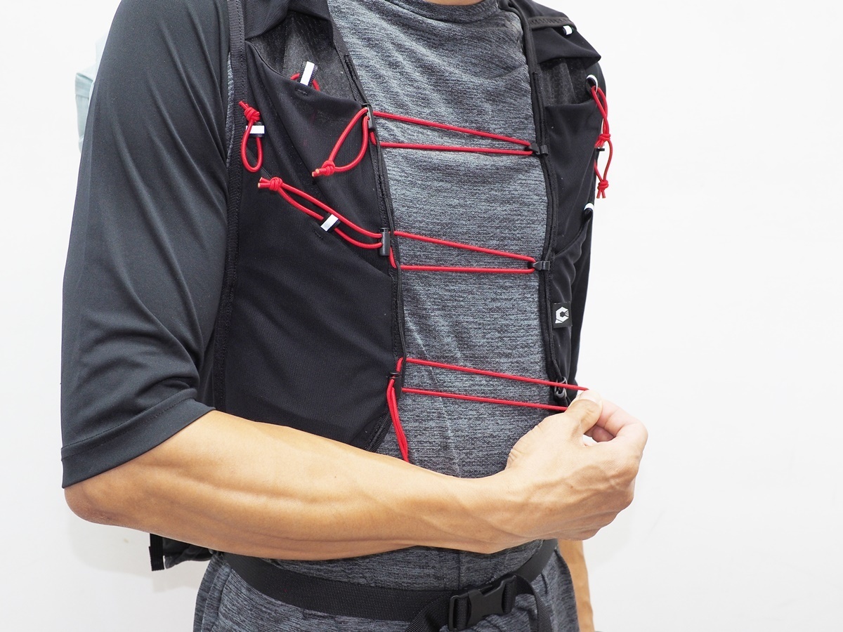 適合收納軟水壺的肩前口袋亦有設置彈性束繩,可反繞加強固定,讓你迅速移動毫無後顧之憂。