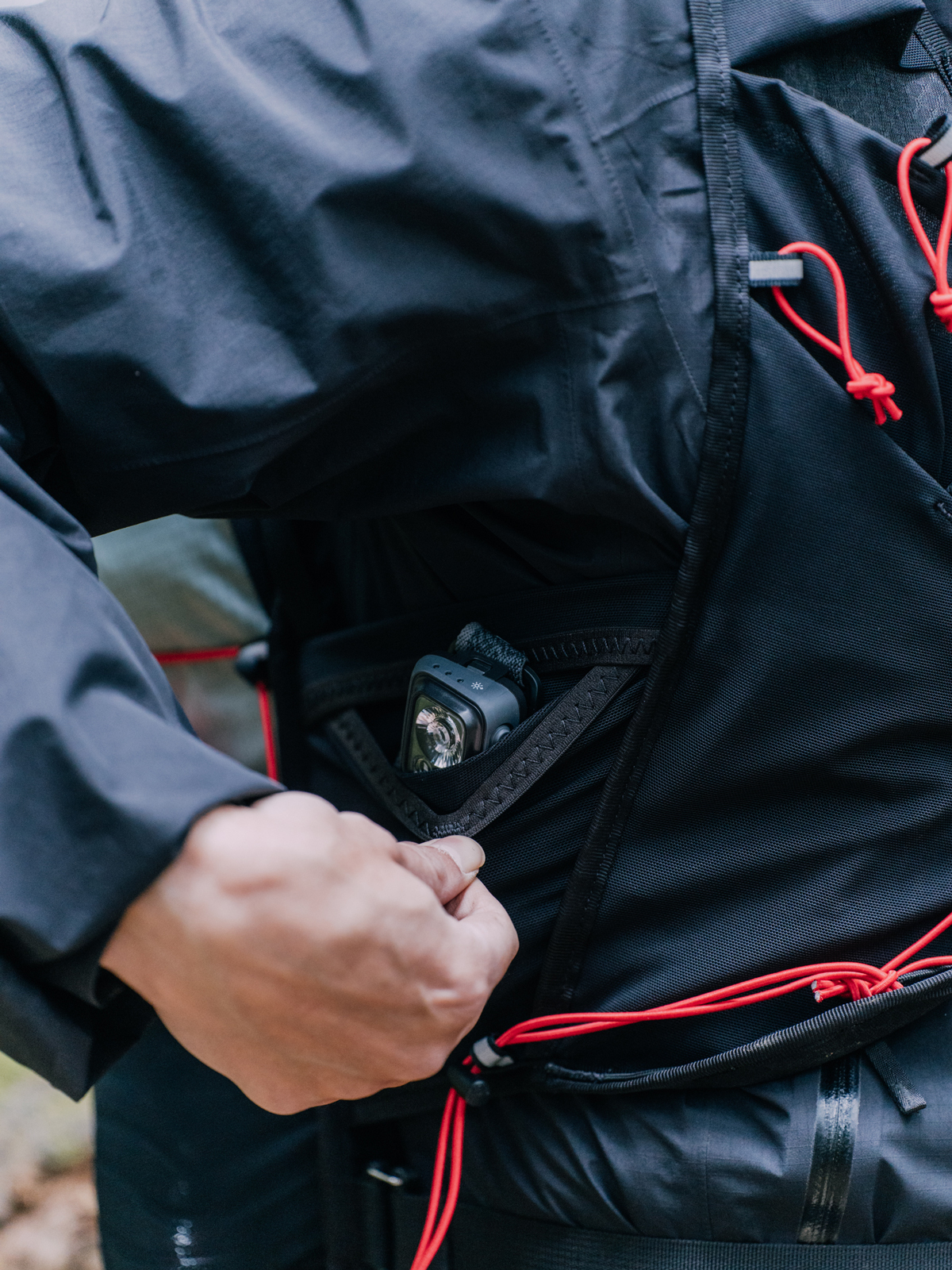 兩側除了收納一般的水瓶,左右雙通快取的特別設計,也能將頭燈、濾水器或是任何行進間可能拿取的裝備收納其中,不用擔心行進間掉落卻同時不用下背包即可拿取。