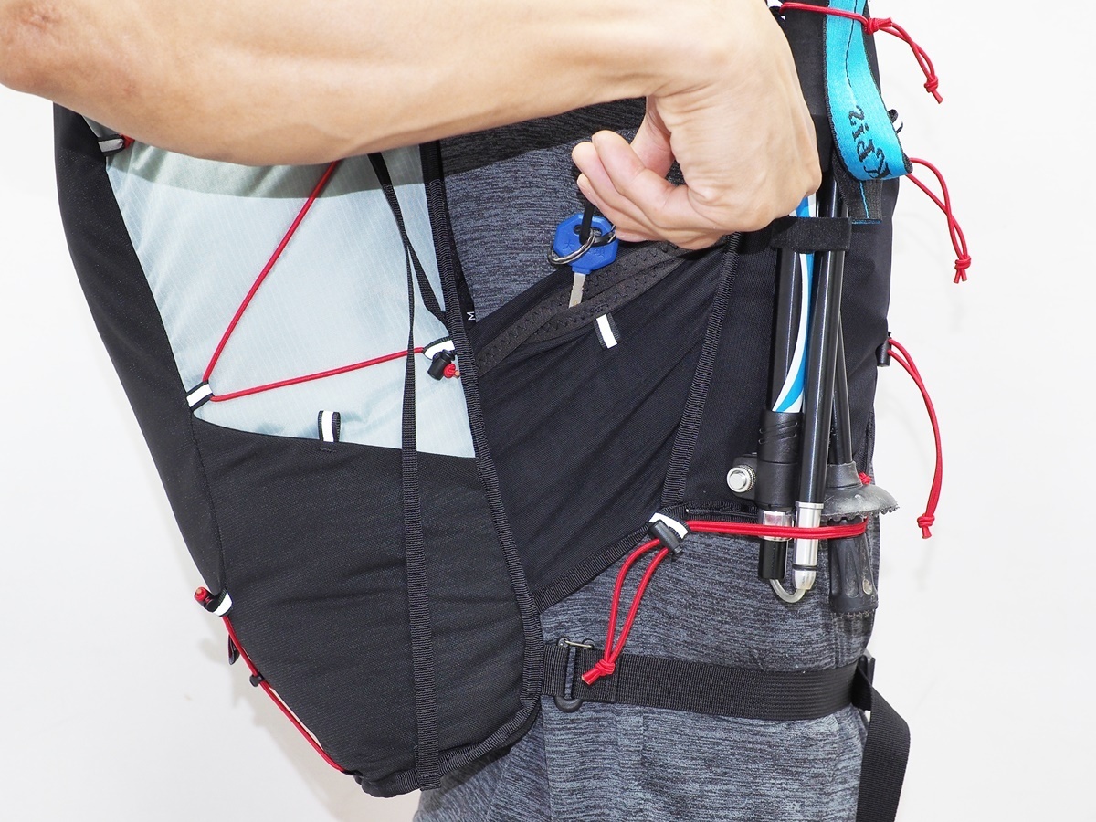 兩側腋下位置設計的彈性口袋,適合收納跑動中較少拿取的錢包、鑰匙、頭燈之類的物品,袋口亦有設計方便拿取的織帶環。