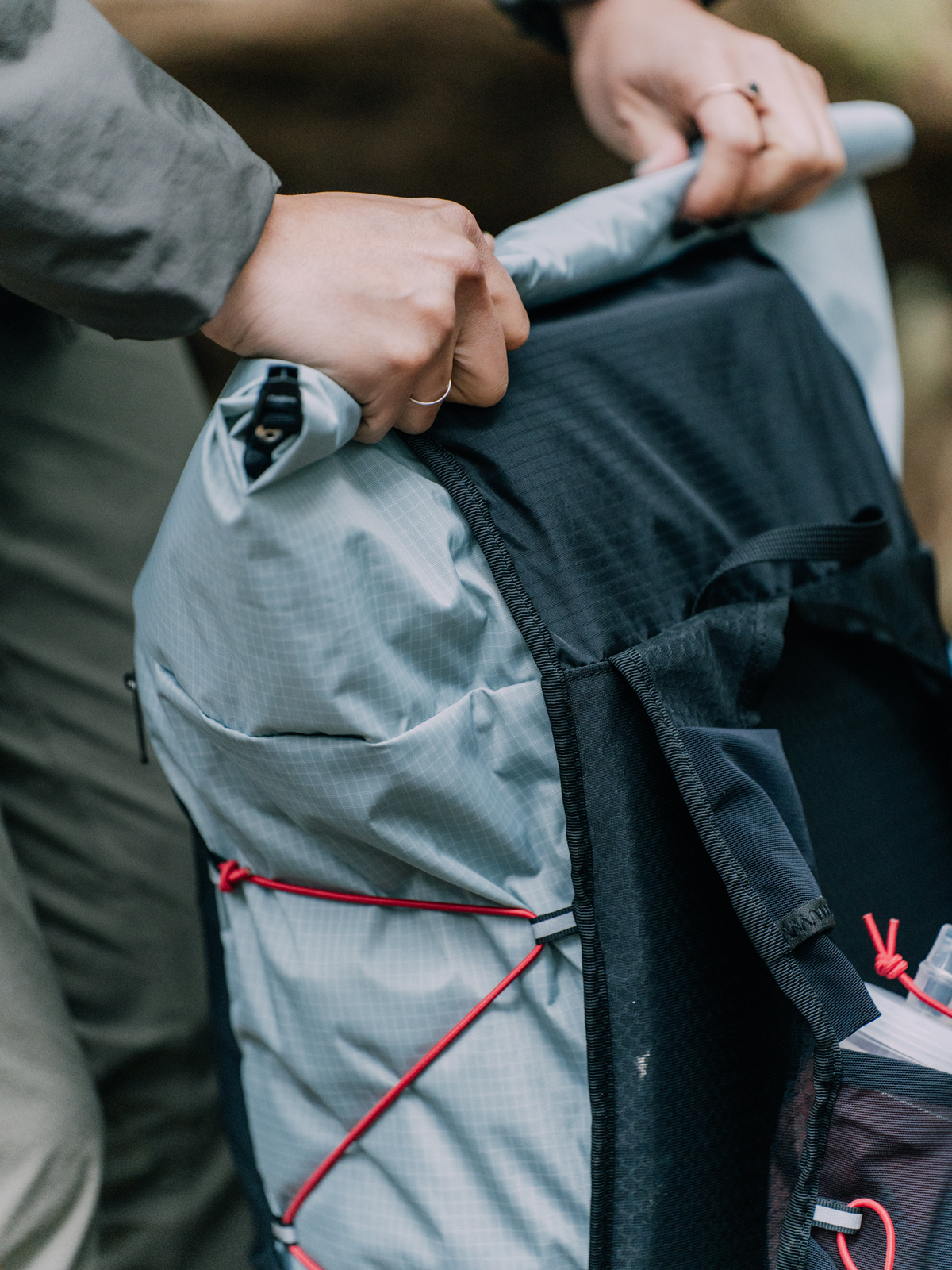 捲收式上蓋設計搭載兩側雙向壓縮系統,搭配背心式的背負讓你輕鬆掌握背包重心,同時提供 14L~32L 範圍的容量彈性空間
