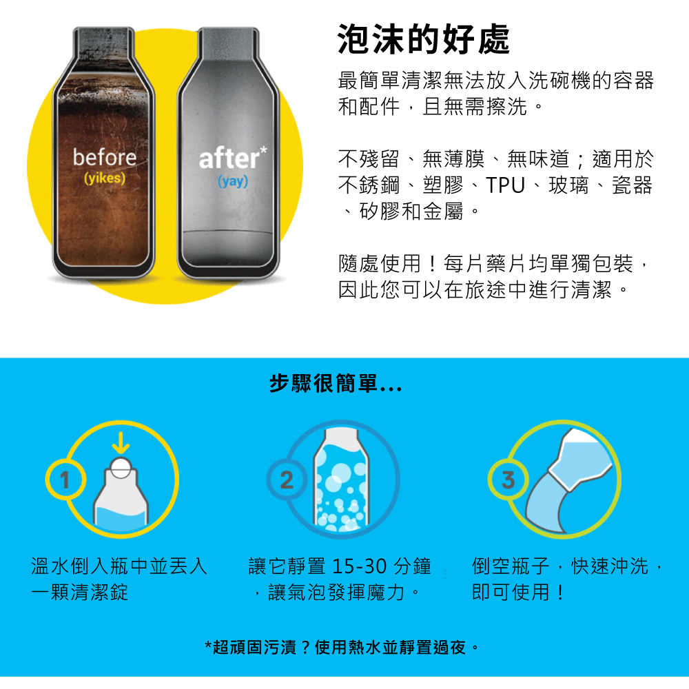 每片清潔錠均單獨包裝,因此您可以在旅途中進行清潔。