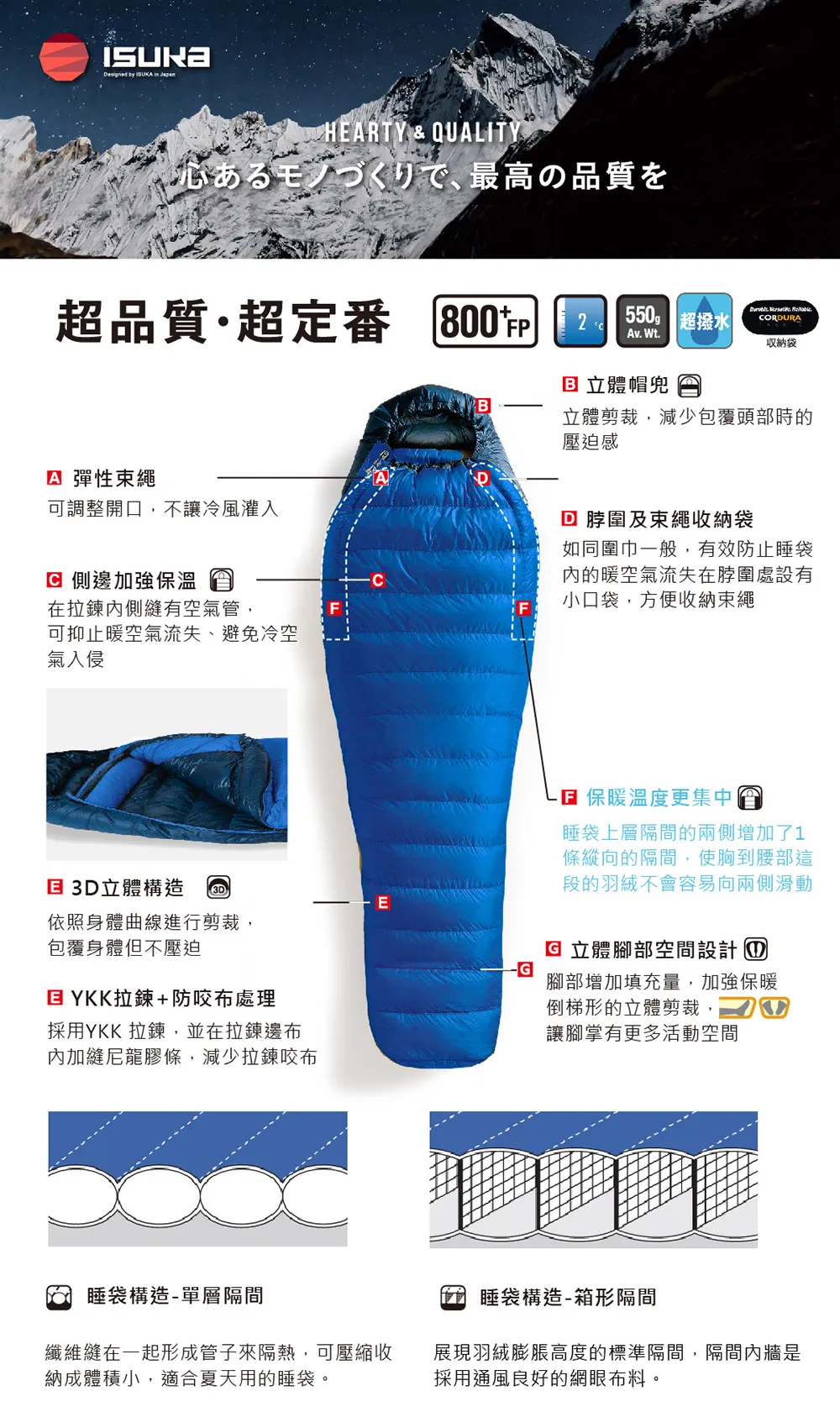 ・全新設計的睡袋隔間,在睡袋上層隔間的兩側增加了1條縱向的隔間,使胸到腰部這段的羽絨不會容易向兩側滑動,將這段的核心保暖溫度更集中。