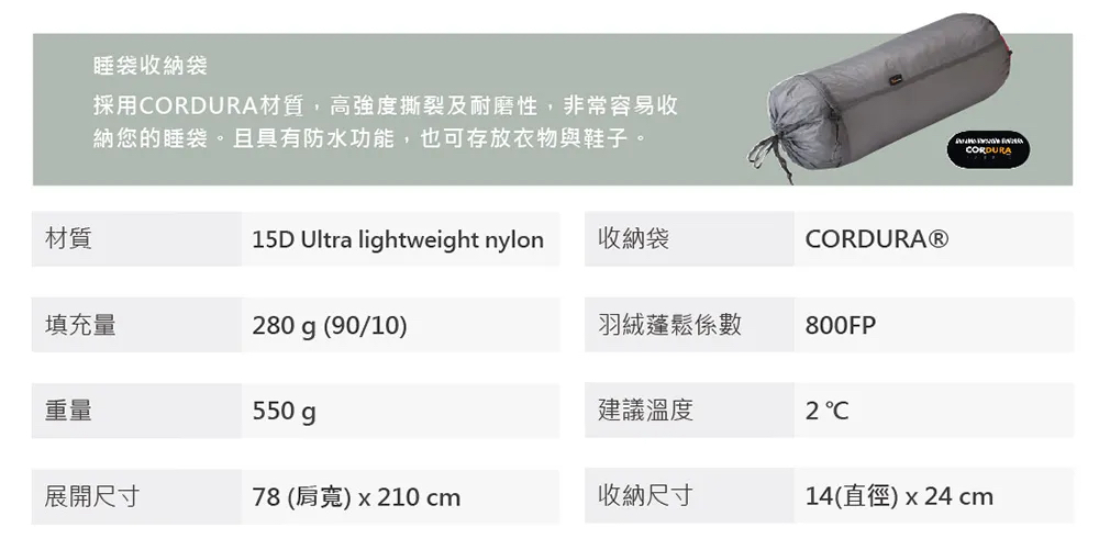 在維持同樣強度的前提下,布料更輕更透氣,且讓羽絨更容易膨鬆。全新設計的睡袋隔間,在睡袋上層隔間的兩側增加了1條縱向的隔間,使胸到腰部這段的羽絨不會容易向兩側滑動,將這段的核心保暖溫度更集中。280睡袋的上層使用立體箱形隔間,背部使用單層穿式車縫,重量更輕且羽絨更集中。