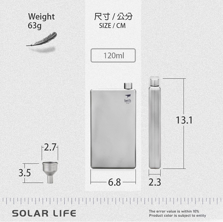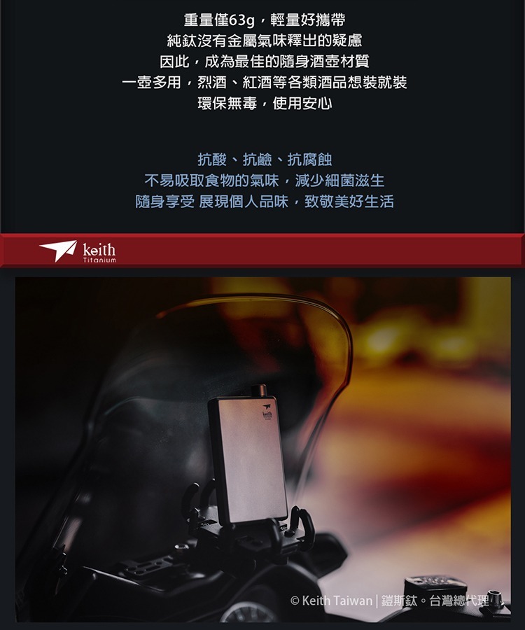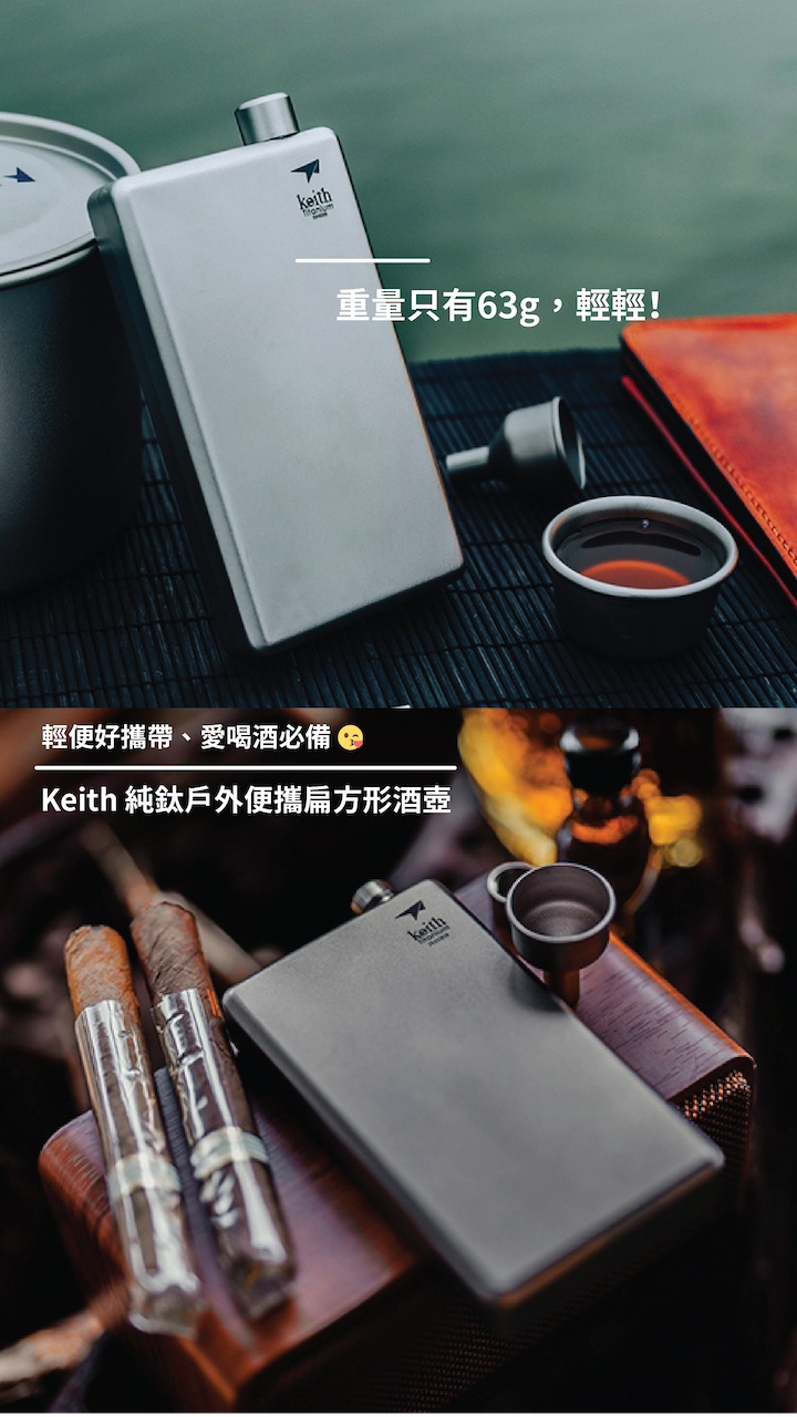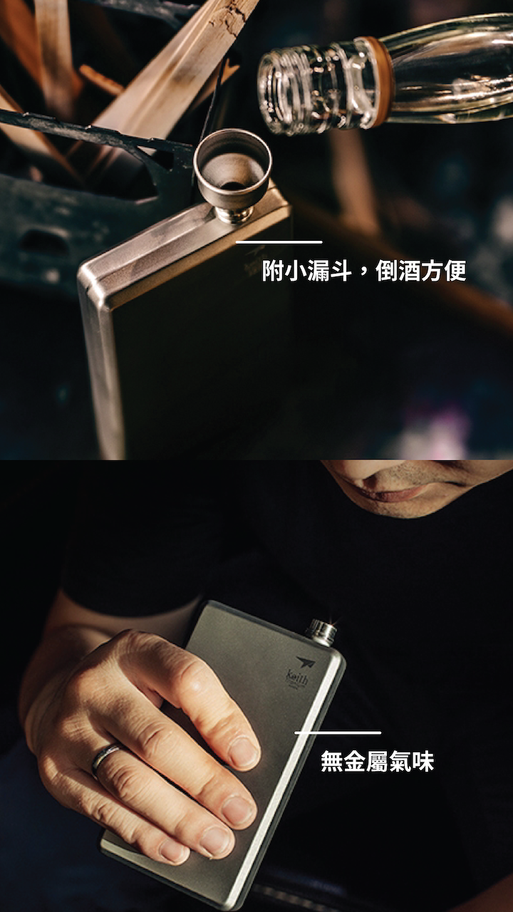 63g輕量便攜,無金屬氣味釋出,通過SGS認證,精緻螺紋瓶蓋保存不滲漏,附加純鈦漏斗方便裝倒酒水。
