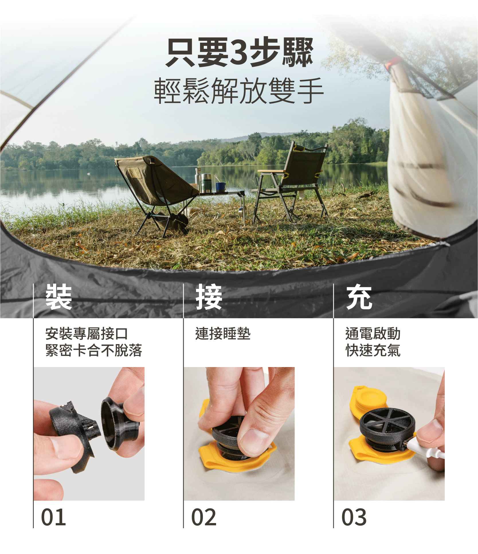 KIN PUMP 採用極致輕量化設計,不同於傳統充氣設備,可快速填充 95% 以上的空氣。充氣完成後,建議依個人睡眠習慣補吹 1-3 口氣,以達到理想的飽滿度與舒適度。