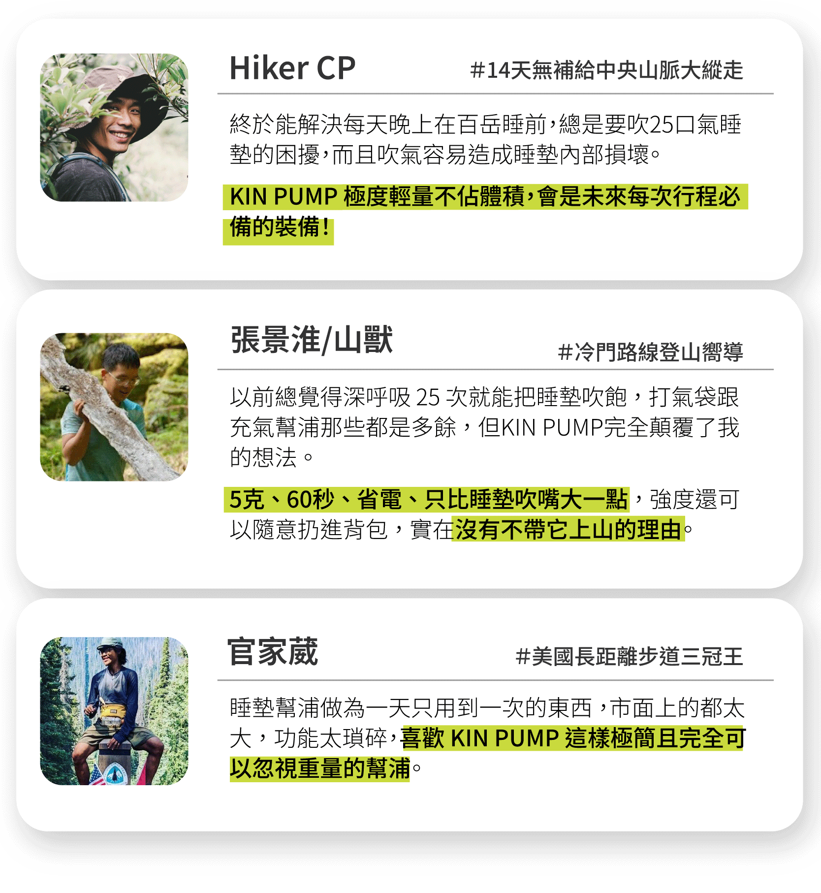KIN PUMP 經過團隊多次測試與調整,確保耐用可靠,讓你帶上山的每一克都值得!