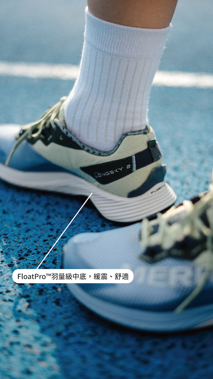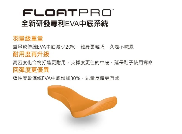 ・FloatPro™羽量級中底,提供持久的輕盈舒適感