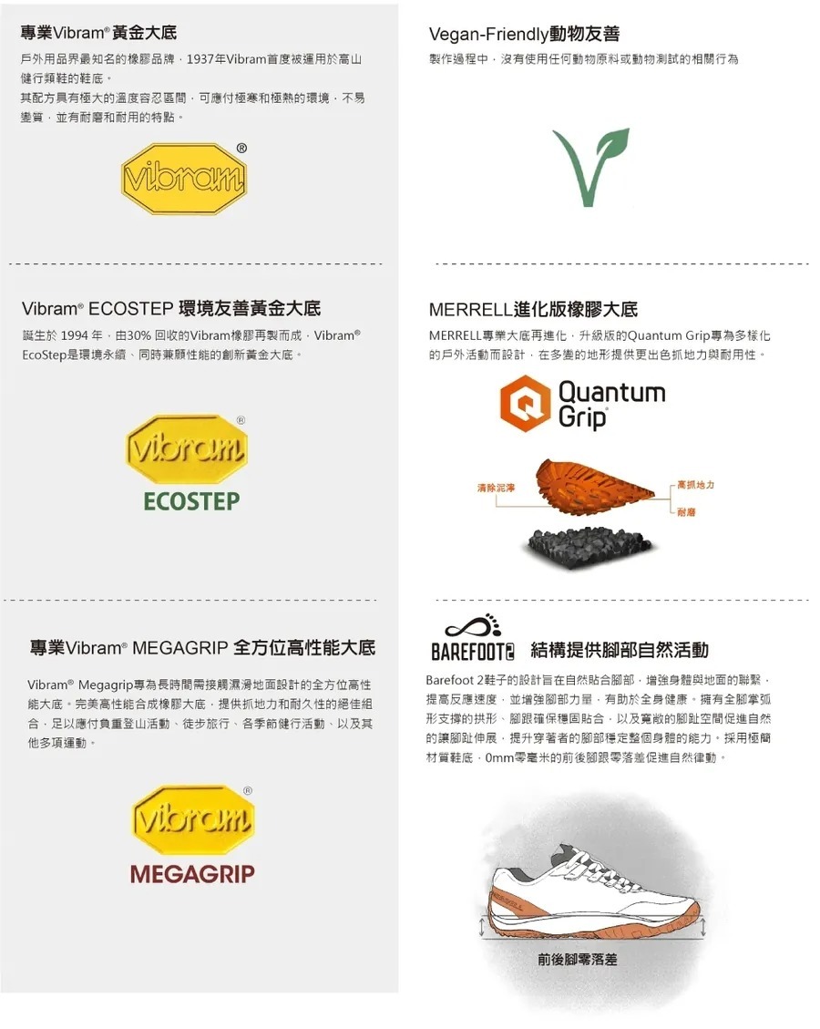 • Vibram® MegaGrip®高性能橡膠大底,具有乾濕地表面無與倫比的抓地力
