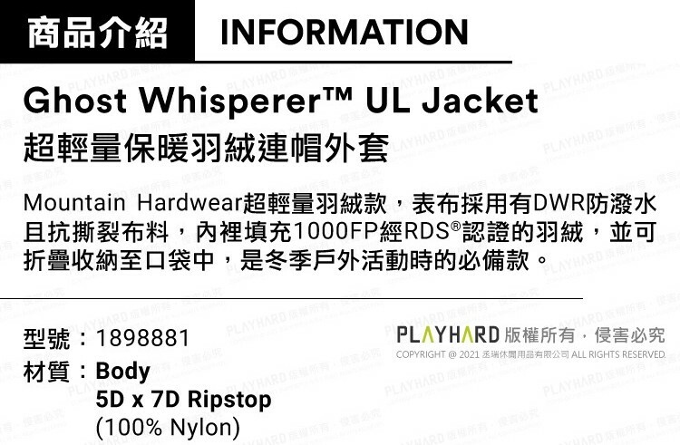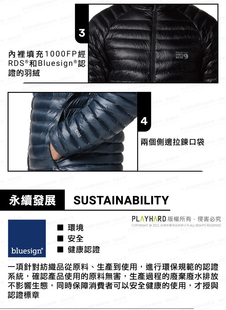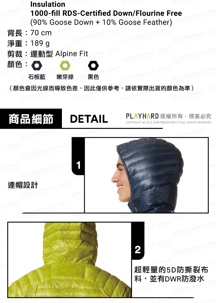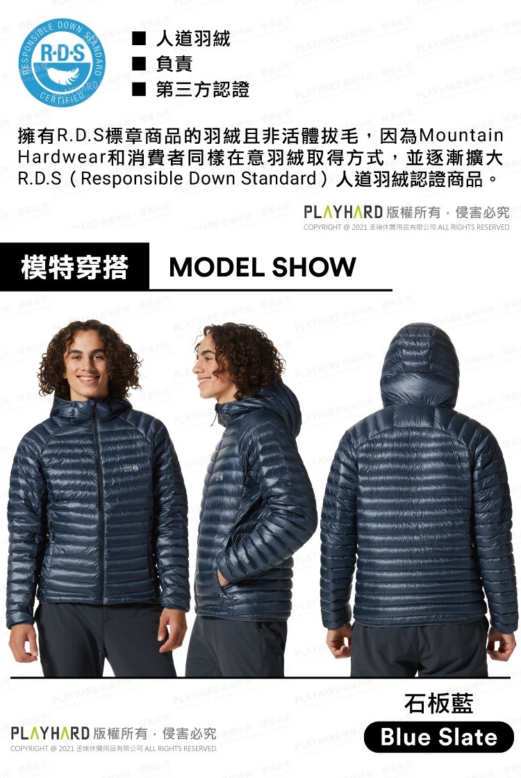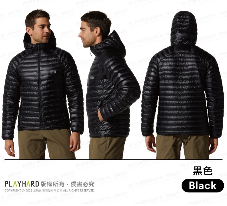 Mountain Hardwear超輕量羽絨款,表布採用有DWR防潑水且抗撕裂布料,內裡填充1000FP經RDS®認證的羽絨,並可折疊收納至口袋中,是冬季戶外活動時的必備款。