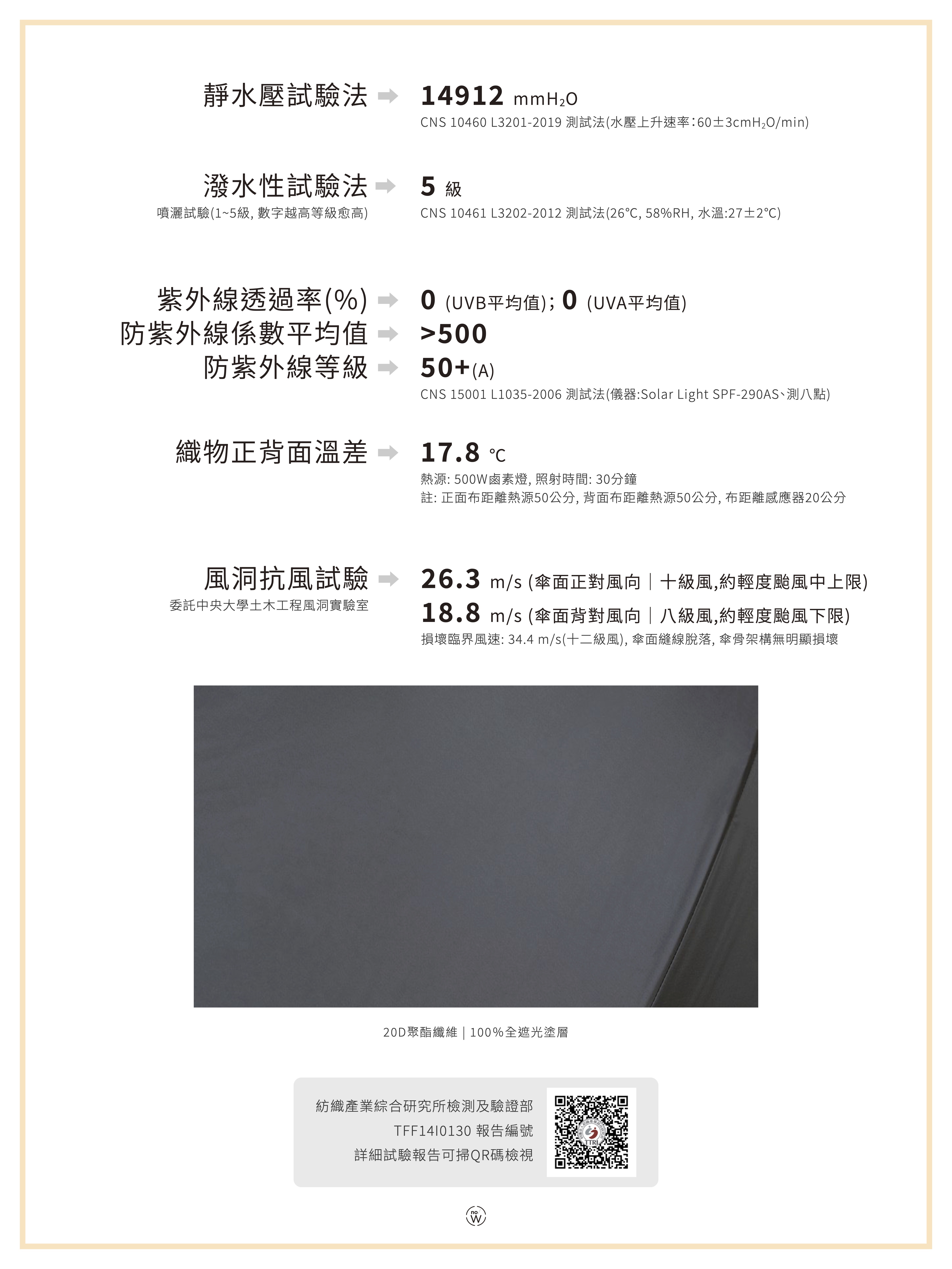 傘布:20D 聚酯纖維,100% 全遮光塗層