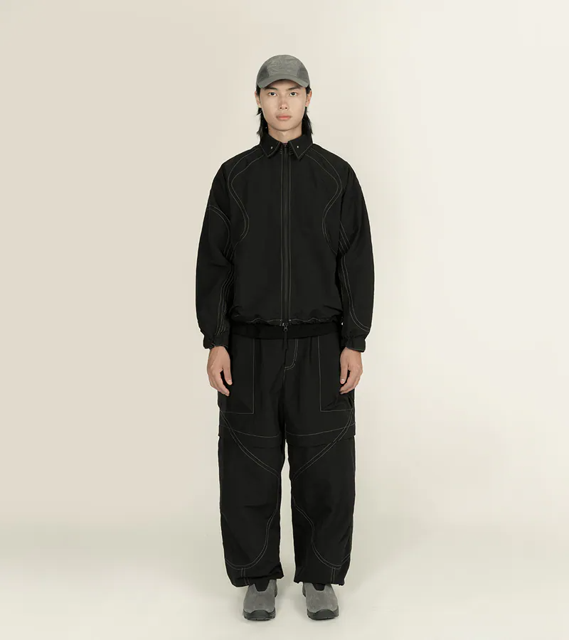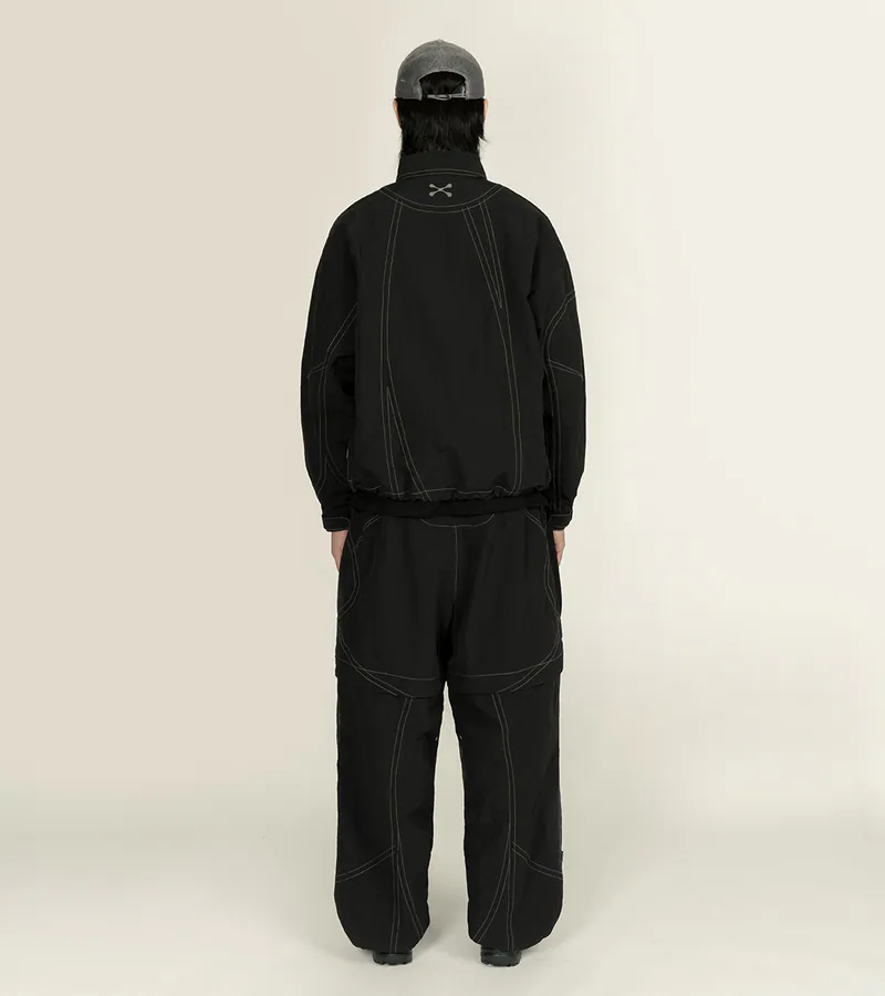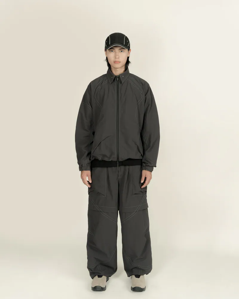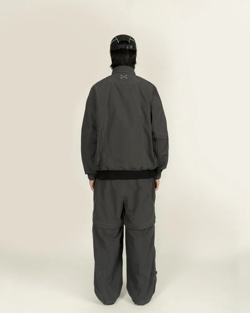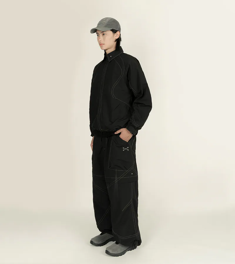 採用輕盈、耐用且具防護性的防潑水皺感紋理面料。褲身具備可拆卸結構,能在長短褲間自由切換。明線拼接與繡眼細節,將機能性轉化為獨特的解構視覺語言。
