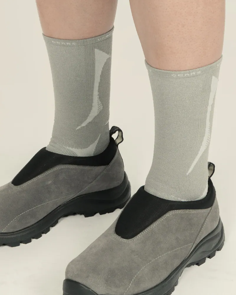 襪底側邊飾有品牌 LOGO 緹花,襪口織入品牌精神語彙「Utility, Coexist, Gears, Urbanite」,以細節呼應 nozzle quiz 的城市探索態度。