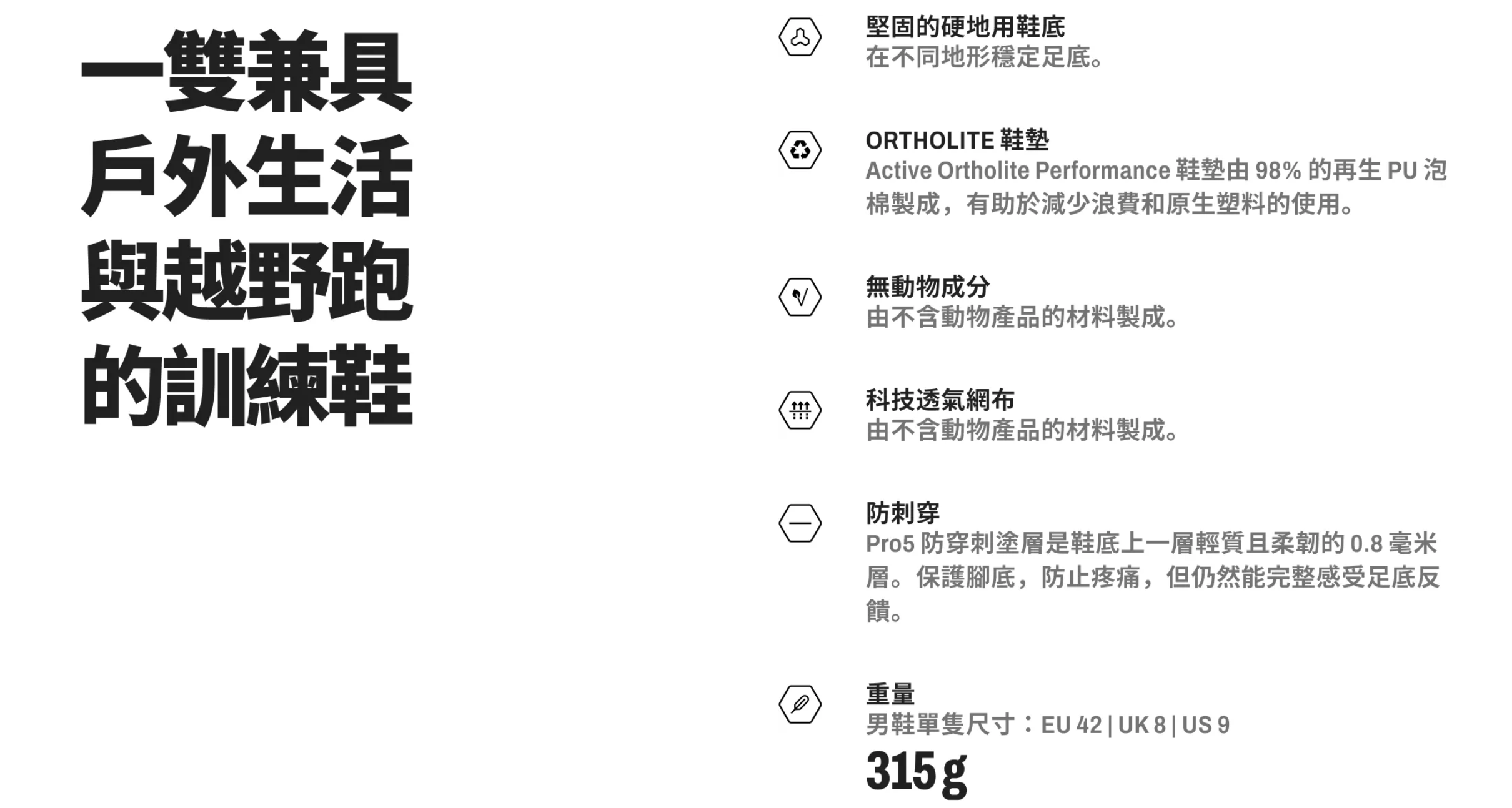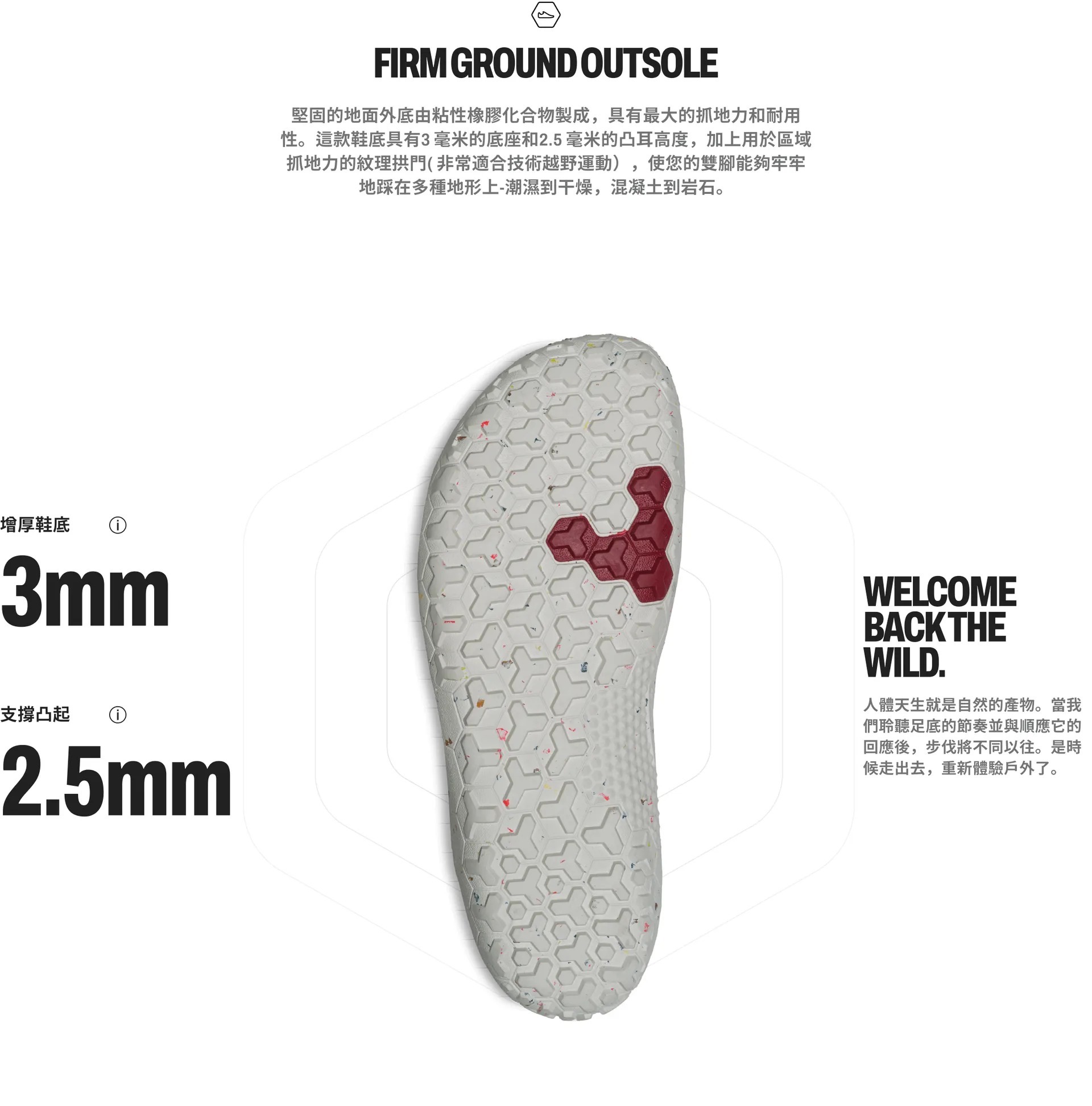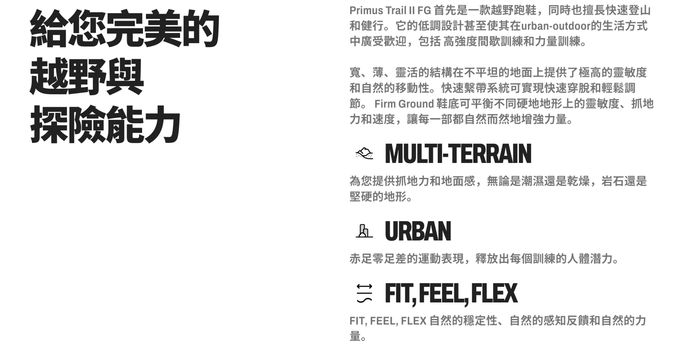 Primus Trail III All Weather Firm Ground是最暢銷的Primus Trail FG的防水進化版。 同樣輕巧、耐用與靈活,適用於各種硬地小徑探險。其所有材料都使用回收的或是無動物成分的高性能材料製成。 另外其採用了防水設計,更適用於在潮濕和較冷的地區從事越野跑或者健行等活動。