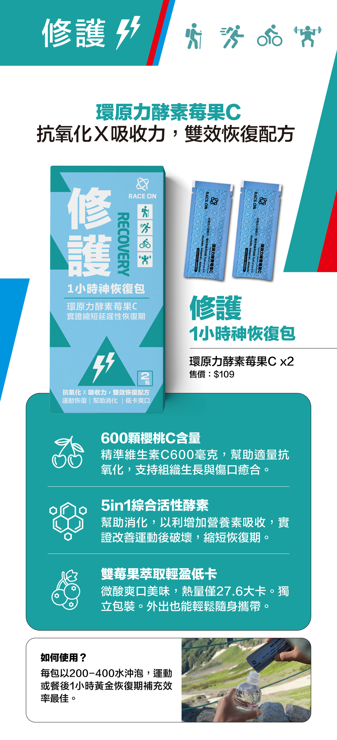 抗氧化X吸收力,黃金恢復期雙效補給,精準維生素C+實證5合1綜合活性酵素,臨床實證改善運動後破壞、縮短延遲性恢復期。