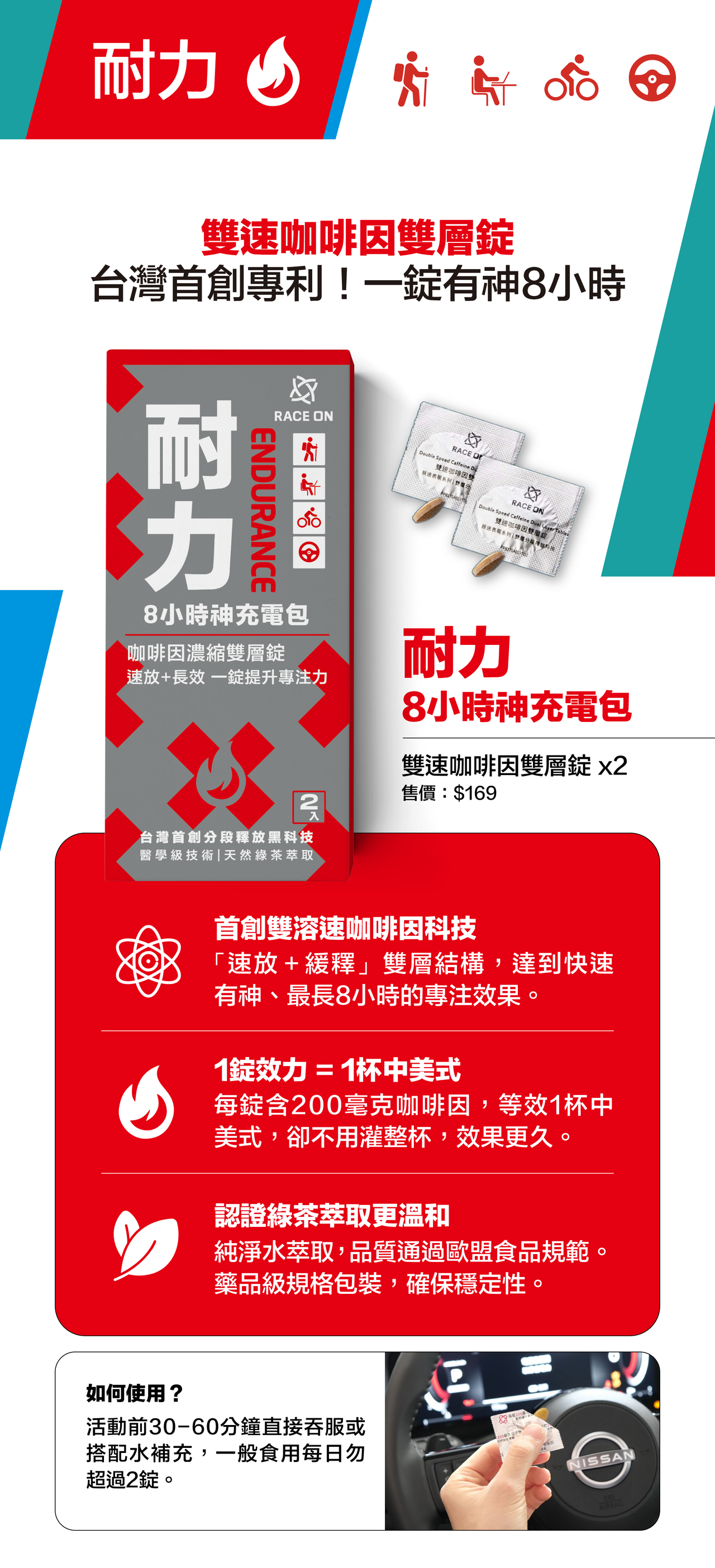 台灣首創專利「速放+緩釋」咖啡因,一錠續航最長8小時,比咖啡還持久。運動前一錠,增強運動表現,溫和超耐力。