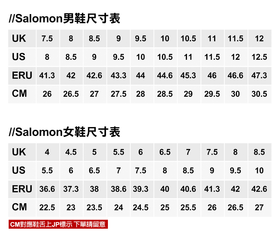 再依照SALOMON 鞋款尺寸表,找到適合自己的size: