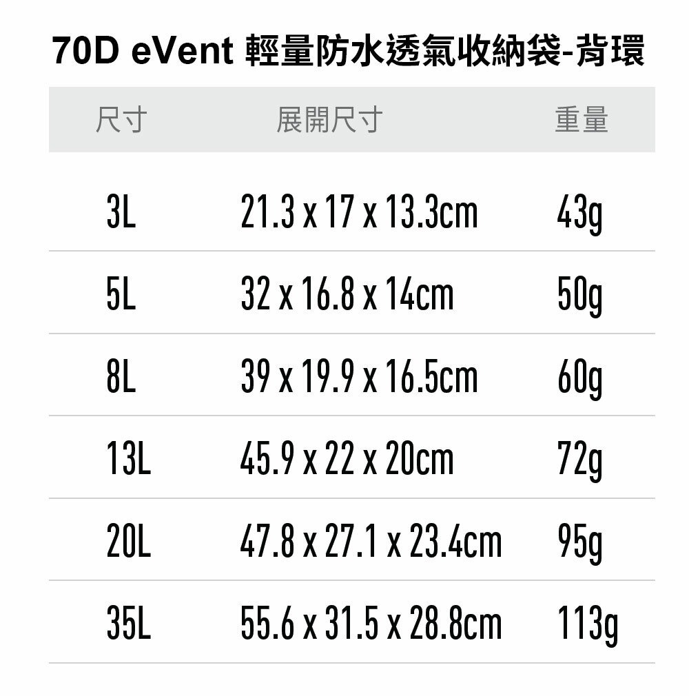 ・底部使用防水透氣的eVent 材質布料,幫助空氣排出節省打包體積