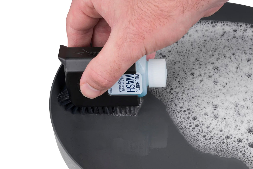 手掌大小得聚丙烯(PP)刷子,方便攜帶、容易使用;尼龍硬毛與刮刀,能有效清除頑垢,並可收納一瓶Wild環境友善萬用清潔劑(50ml)。