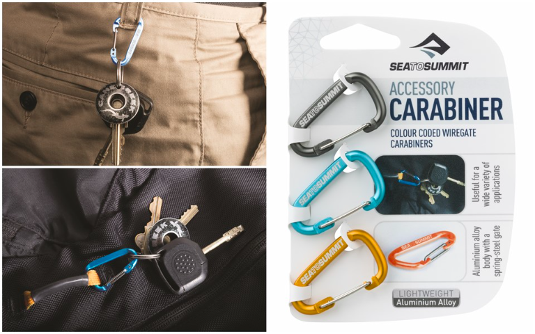 超級輕量、陽極氧化鋁所製成的無鎖工 具勾環為3 色組合。可做多用途使用, 包括串接鑰匙、將緊急照明附掛於背包 上、迅速將反光繩索與天幕做串接。