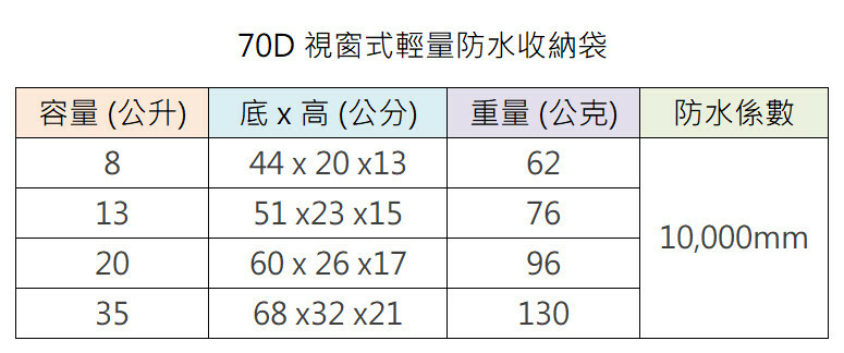 改良原始耐用的輕量防水收納袋,多了透明TPU 製窗戶,增加可視度;並將底部改成橢圓狀,站立更加容易。全新可透視防水收納袋可以一眼看出裝備位置,取物便利,非常適合共用背包的人使用。TPU 製透明窗戶使用焊接技術從側邊嵌入進布料中,耐用程度與布料本身相同。