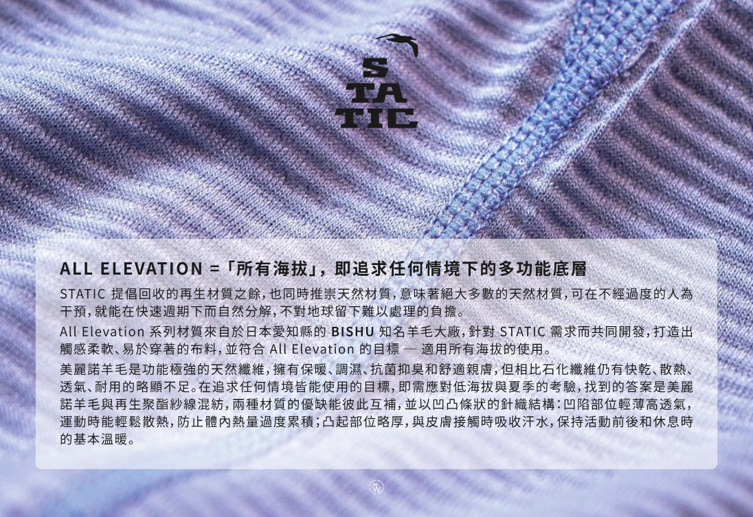 ALL ELEVATION 的意思是「所有海拔」,追求在任何情境下皆能使用的多功能底層衣,一年四季都能舒適地被穿著,即使在夏天也能享受功能性極強的羊毛。