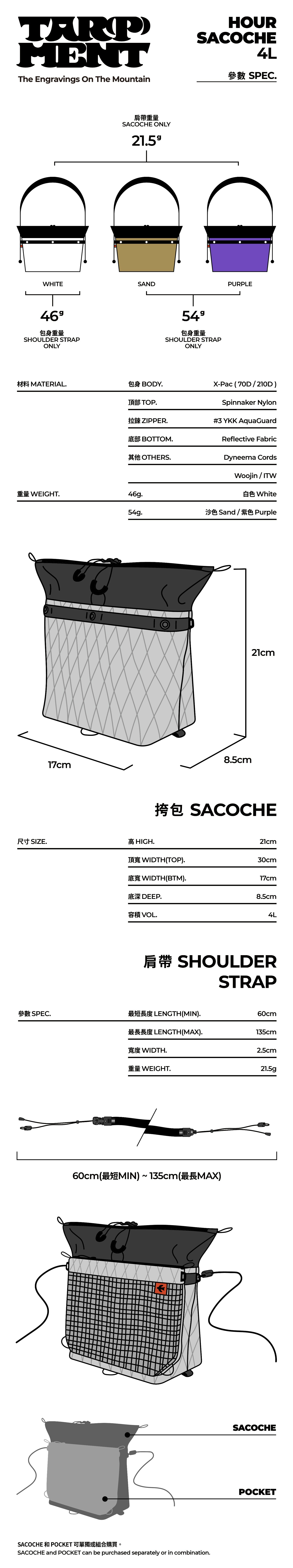 挎包使用三種輕量且功能性面料,主包採用防水且抗撕裂面料 X-Pac 或 Dyneema X-Grid,頂部輕量且堅挺的 SPINNAKER 面料,反光面料在底部增加夜間使用安全性。肩帶使用可調節和快拆的輕量設計,長度調整在65-115CM,快速長度調節系統,即使在山中徒步也可及時調整背負高度。