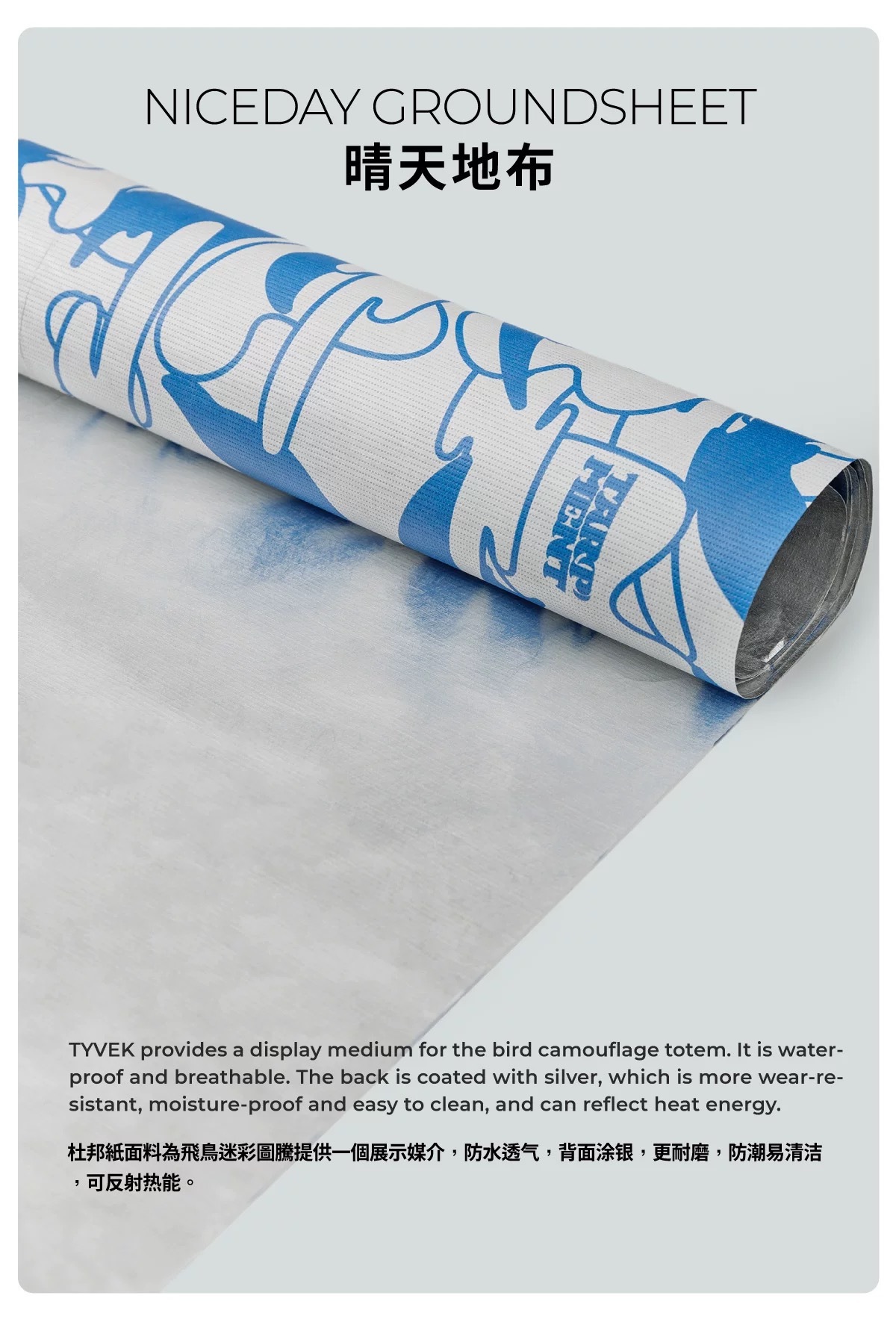 採用杜邦紙面料替代常見的地布面料,杜邦紙充分展示了晴天飛鳥迷彩圖案,藍白醒目配色,防水防潮易清潔,背面塗銀更耐磨。
