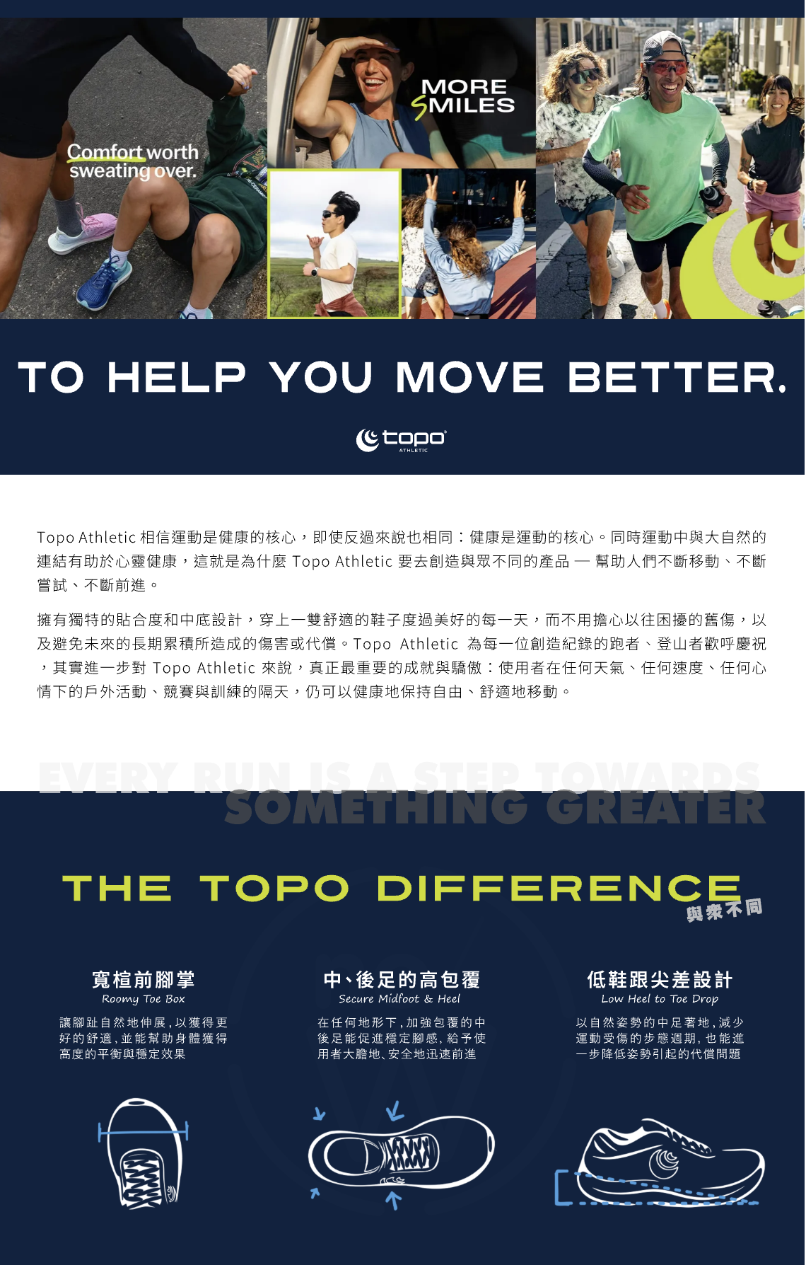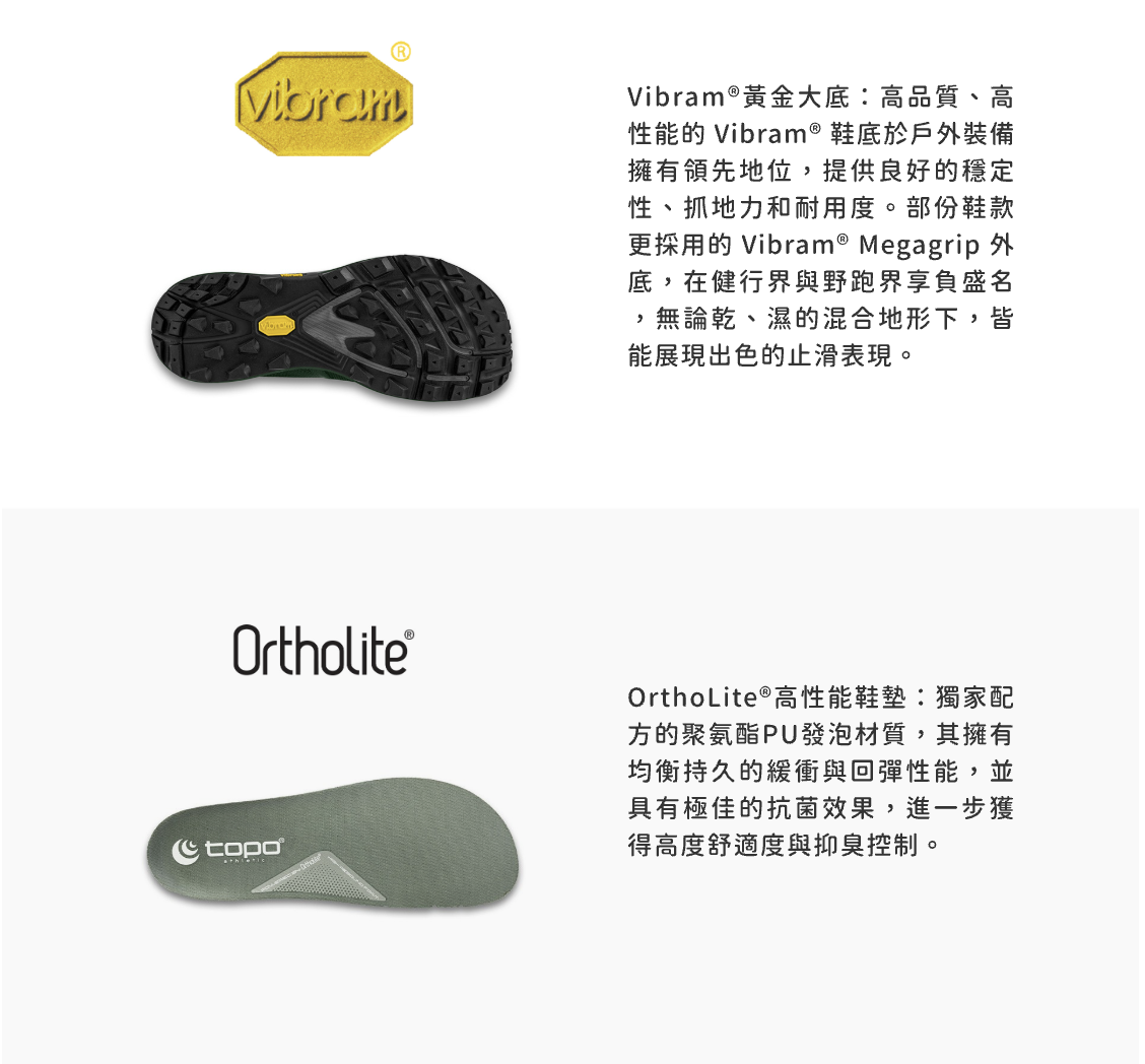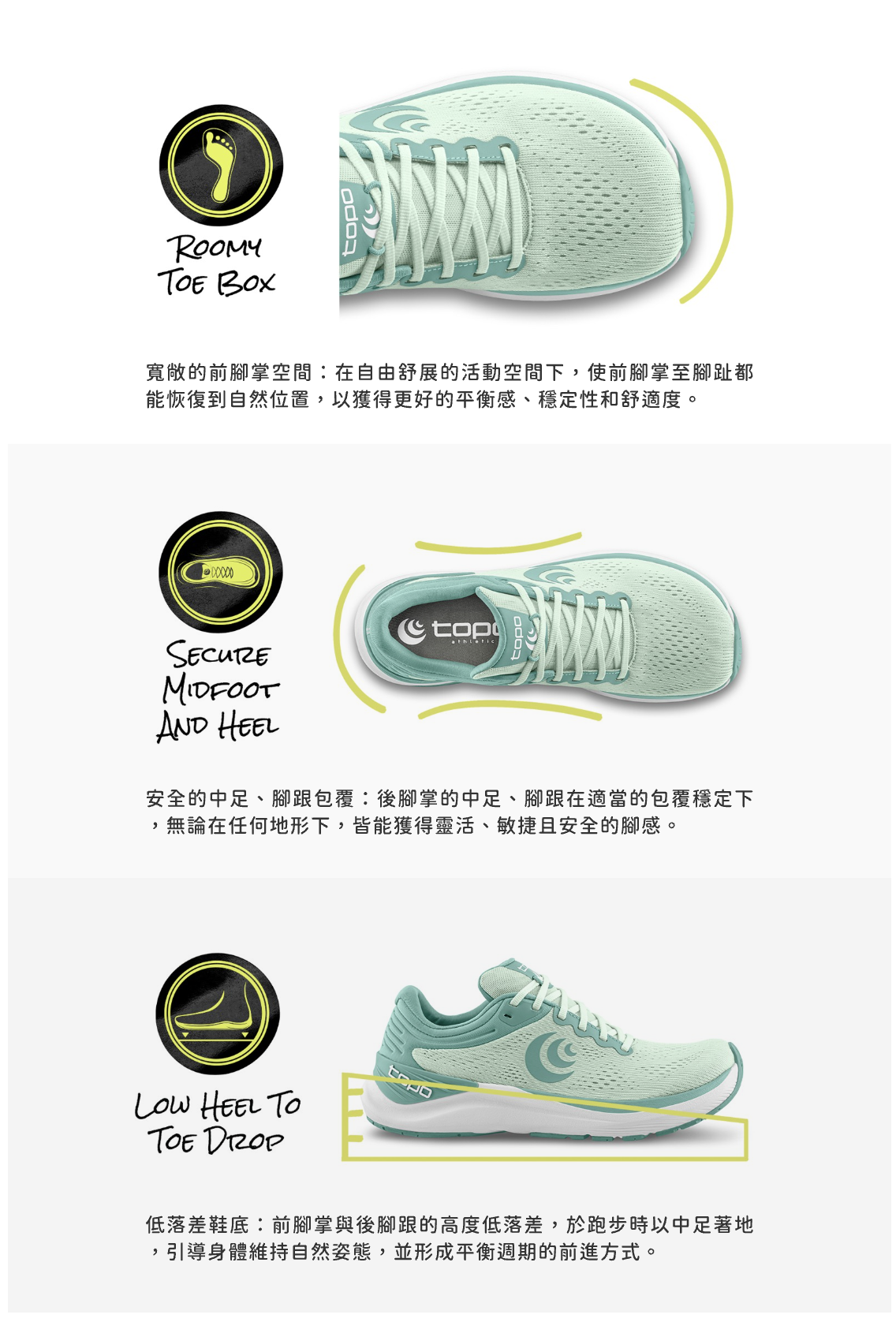.寬敞鞋頭設計:Topo Athletic 標誌性寬敞鞋頭,讓前腳掌與腳趾能自然舒展,符合跑步、健行的人體工學,有助於促進足部健康。
