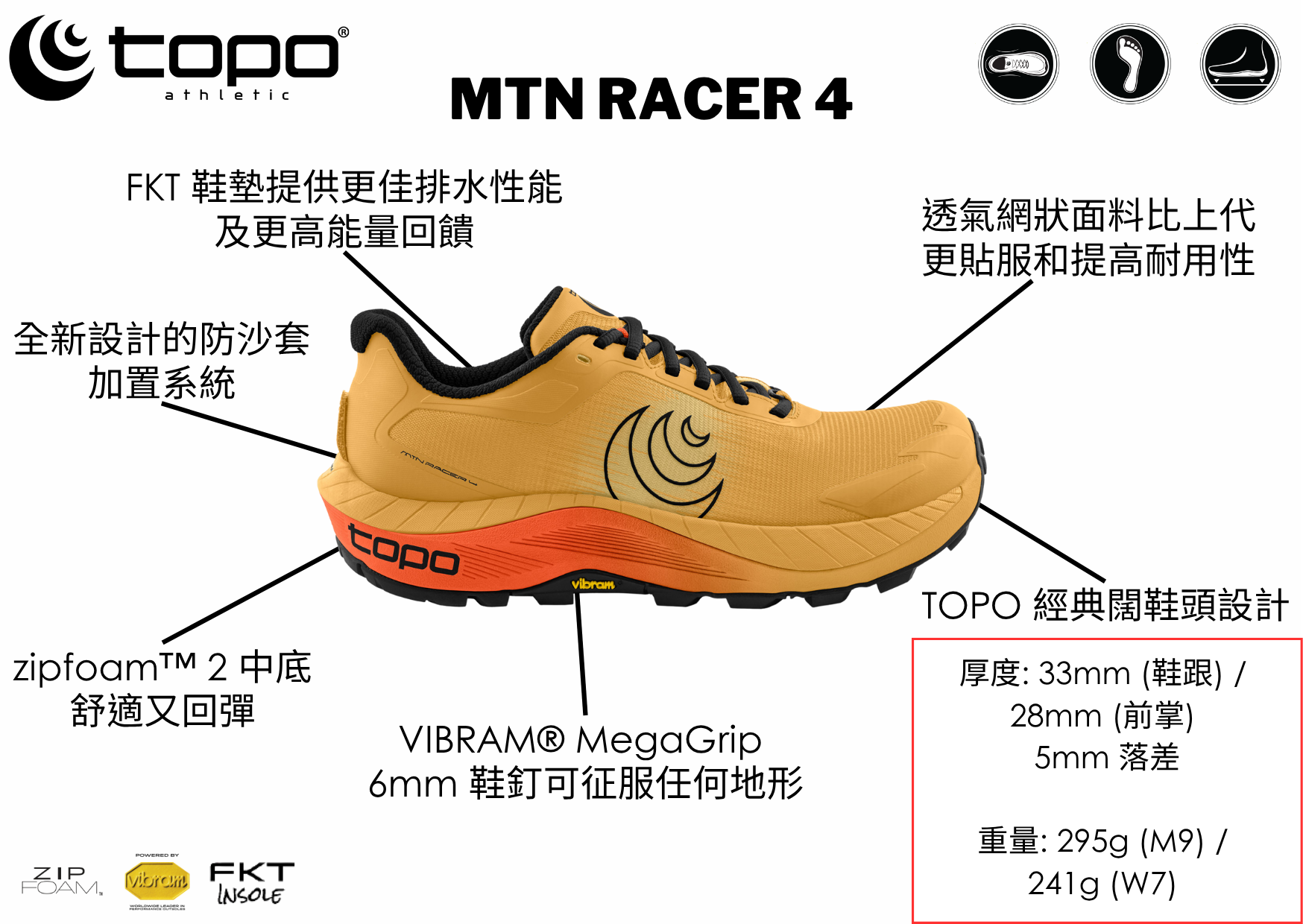 .長距離暢銷款:全新第四代的 MTN Racer 4,專門設計給在技術地形上,進行長途的快速奔跑而設計,為競賽中最受歡迎的款式。