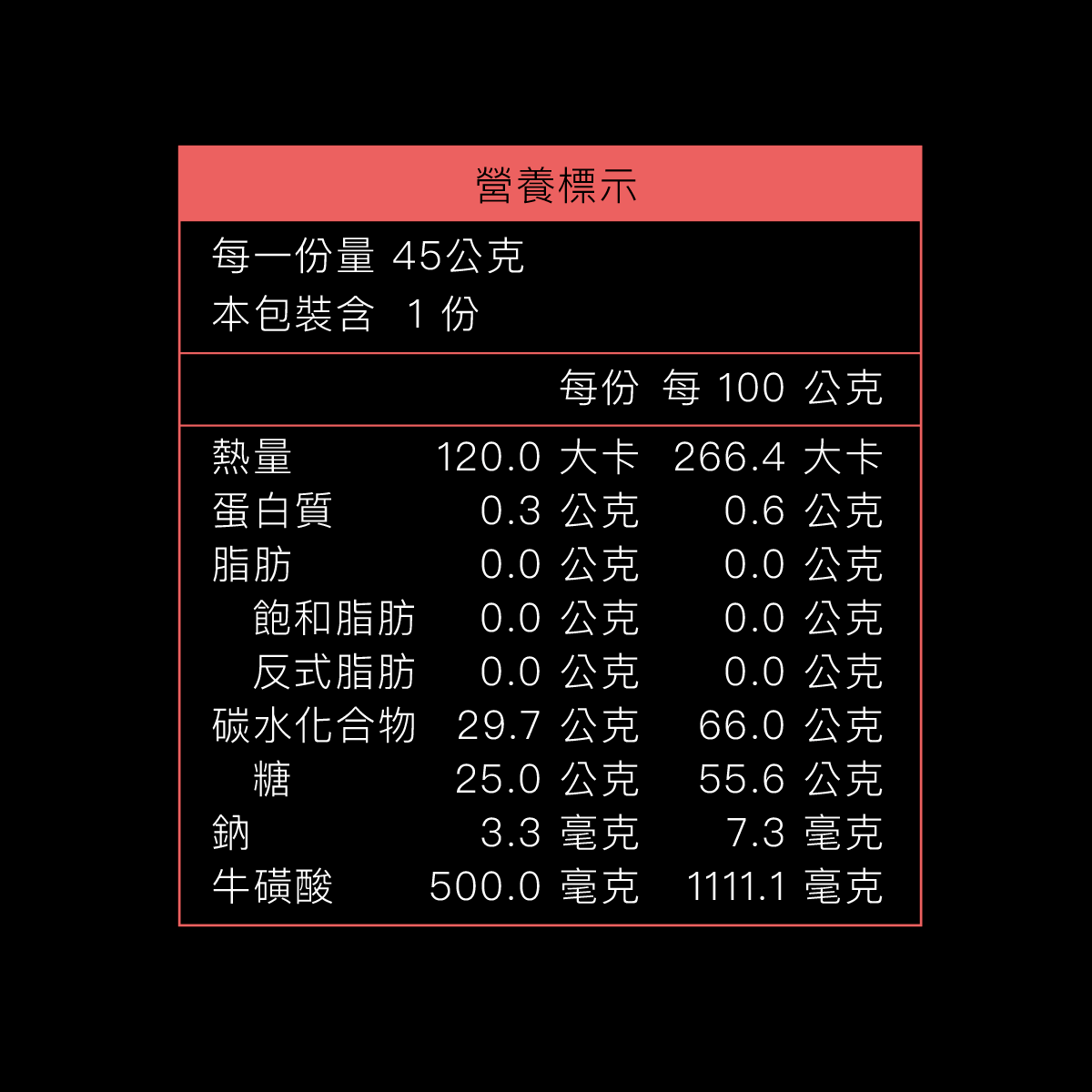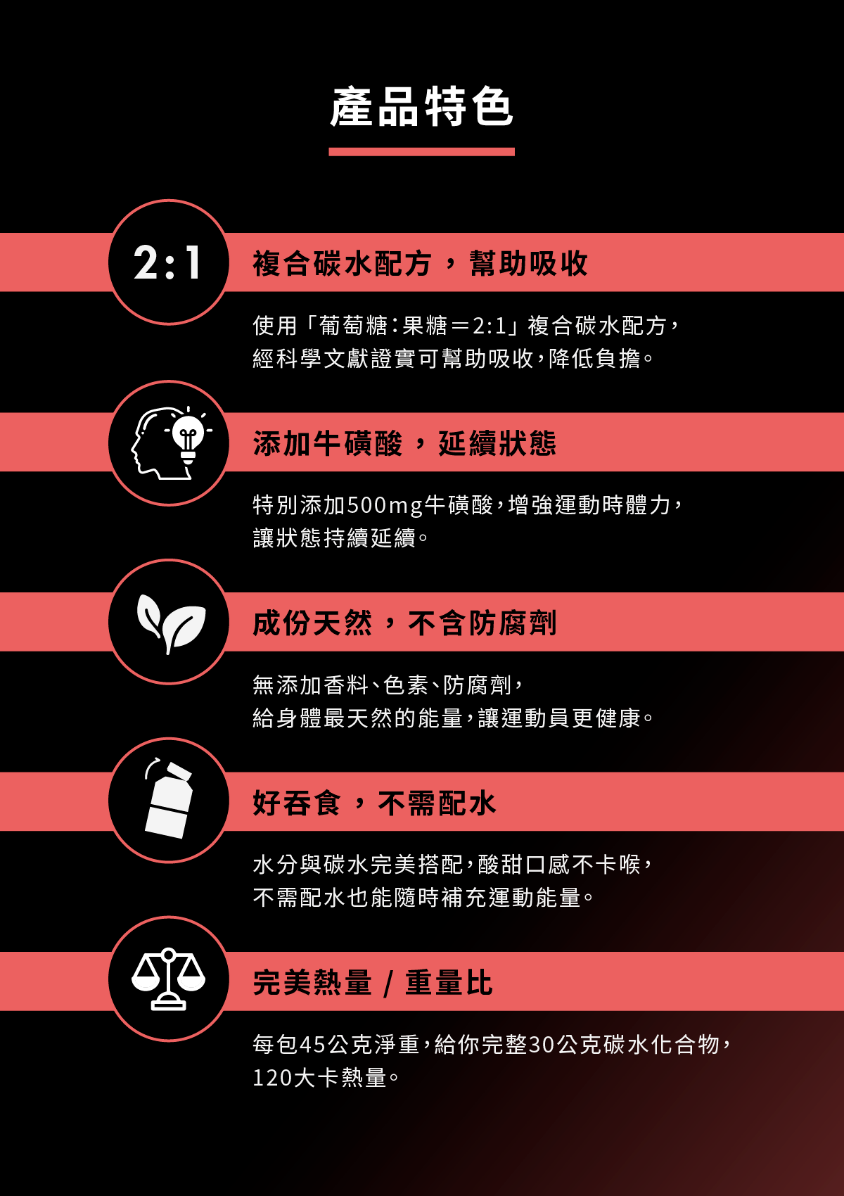 6. 完美熱量/重量比,每包45公克淨重,給你完整30公克碳水化合物,120大卡熱量