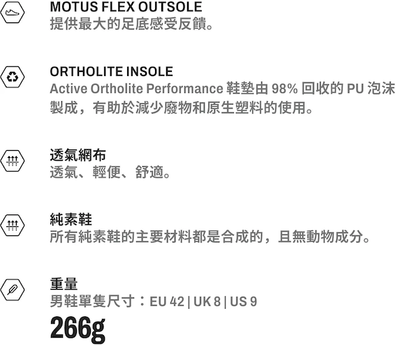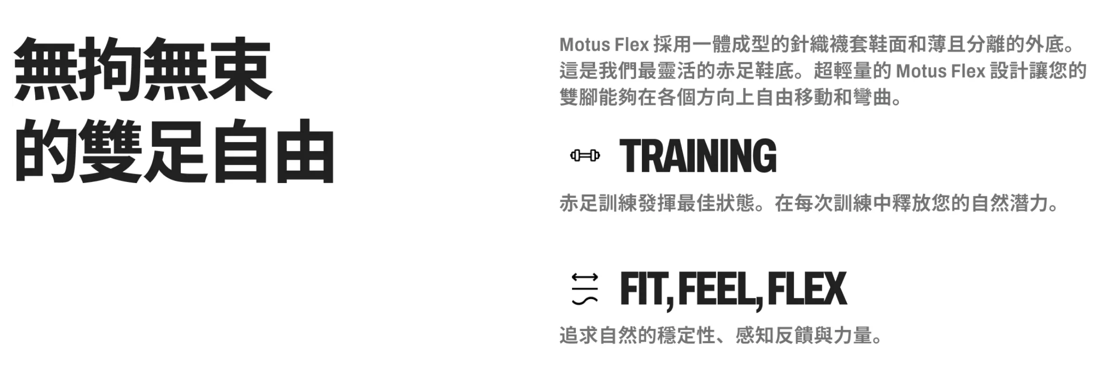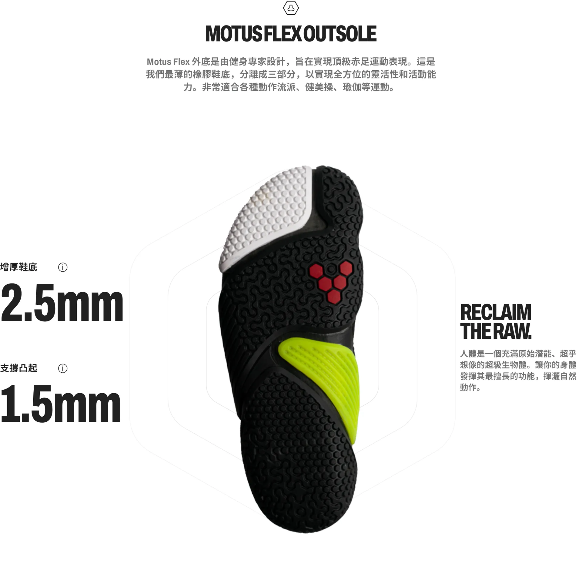 Motus Flex 是我們最具赤足敢的訓練鞋,旨在提供健身操、各種動作流、徒手訓練等提供無與倫比的赤腳感和靈活性。即便不是赤腳,也能感受到如同赤腳般的感覺,體驗每一絲細微的足底反饋。