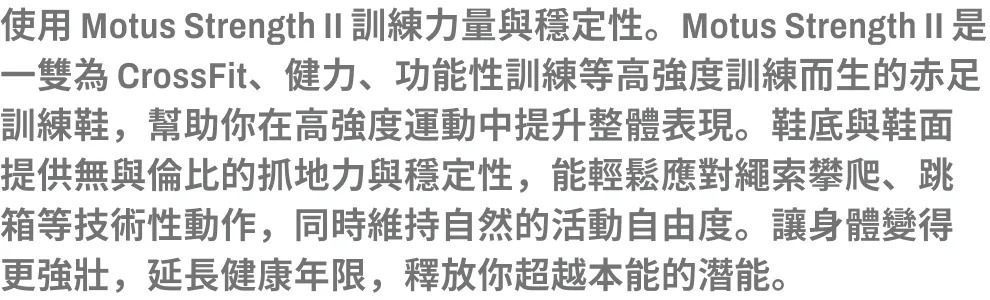 Motus Strength II 是我們專為高強度訓練打造的赤足訓練鞋的全新升級版本。