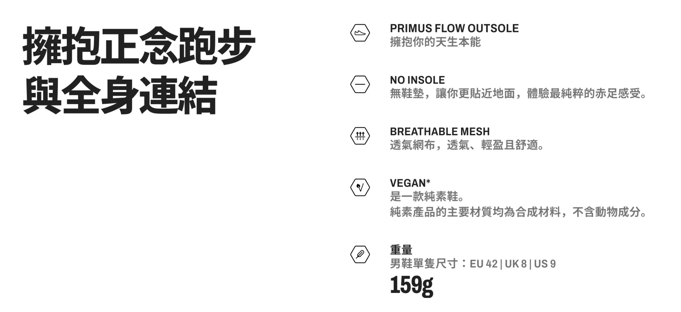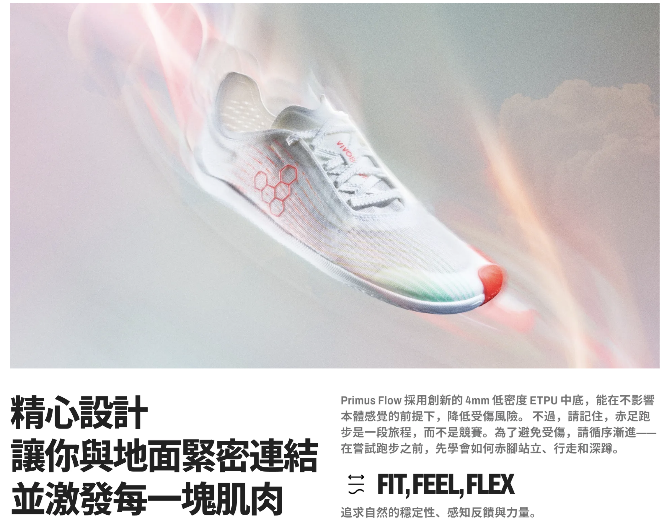 Primus Flow 是 Primus 系列的最新鞋款,專為極致赤足跑而設計。這款超輕量跑鞋——重量僅 150 克,除了是我們最輕量的跑鞋,更旨在提供高效無拘無束的自然運動體驗。鞋面採用輕盈透氣的工程回收網布製成,捨棄多餘覆層,採用極簡無縫設計,讓雙腳享受純粹的自由感。
