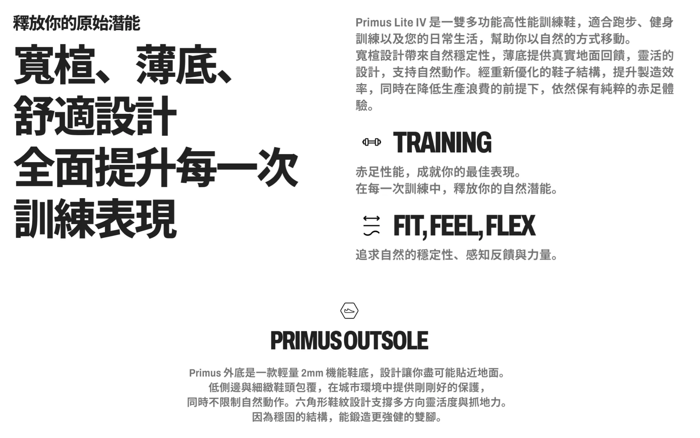 Primus Lite IV 延續一貫值得信賴的赤足腳感,採用再生與純素*材質製作——無論是跑步或訓練,都能自然自在地移動。寬楦、薄底、靈活設計,全面提升每一次運動表現,同時留下更輕盈的環境足跡。
