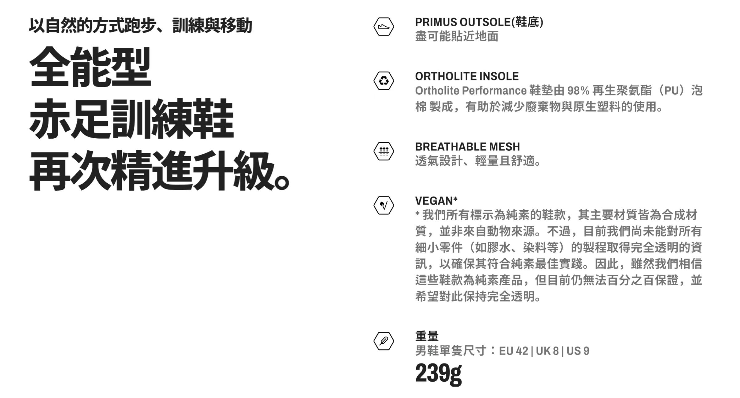 Primus Lite IV 延續一貫值得信賴的赤足腳感,採用再生與純素*材質製作——無論是跑步或訓練,都能自然自在地移動。寬楦、薄底、靈活設計,全面提升每一次運動表現,同時留下更輕盈的環境足跡。